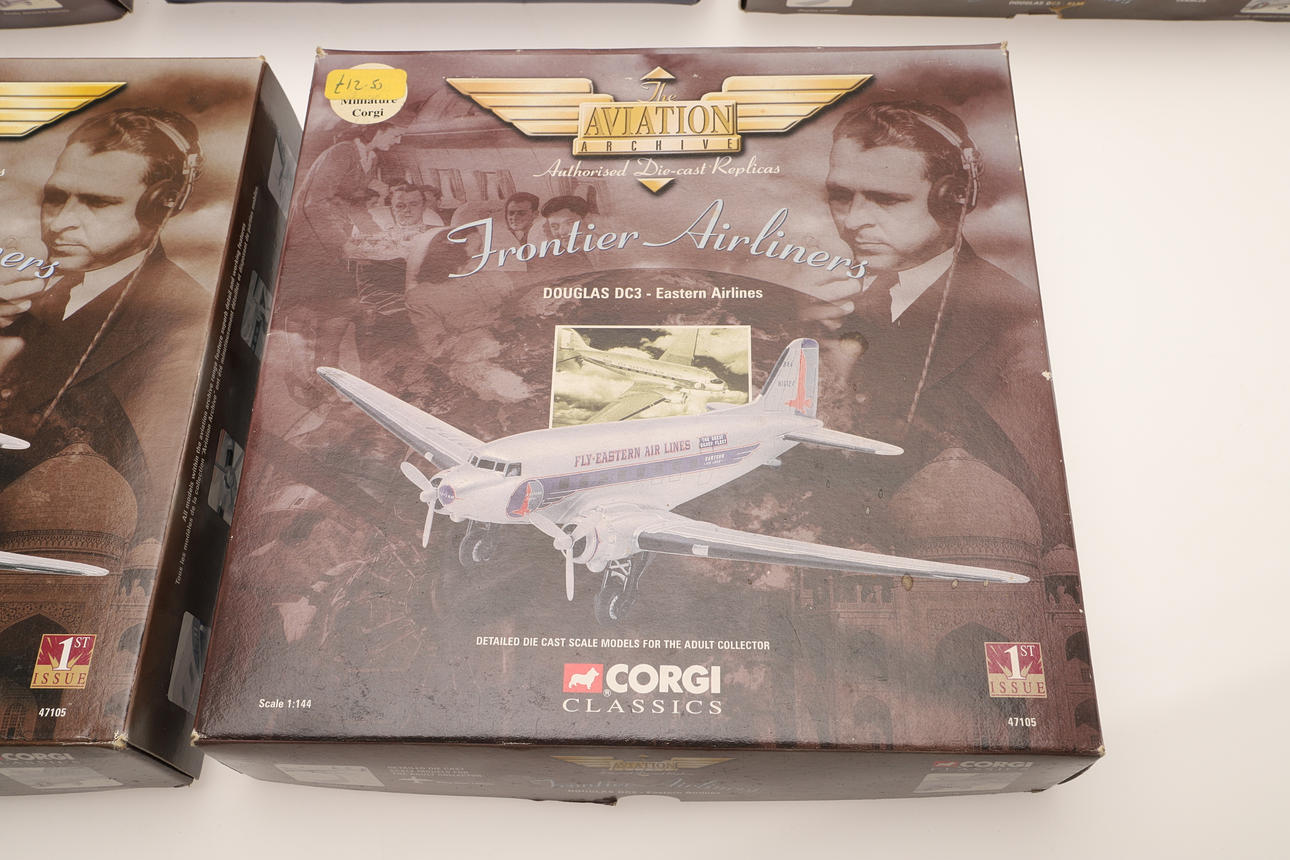 Various boxed Corgi Toys including Mc Donnel F4J Phantom (box 35cms by 28cms), and six smaller boxed aircraft including Douglas DC3, Douglas Dakota, and Junkers. (7).