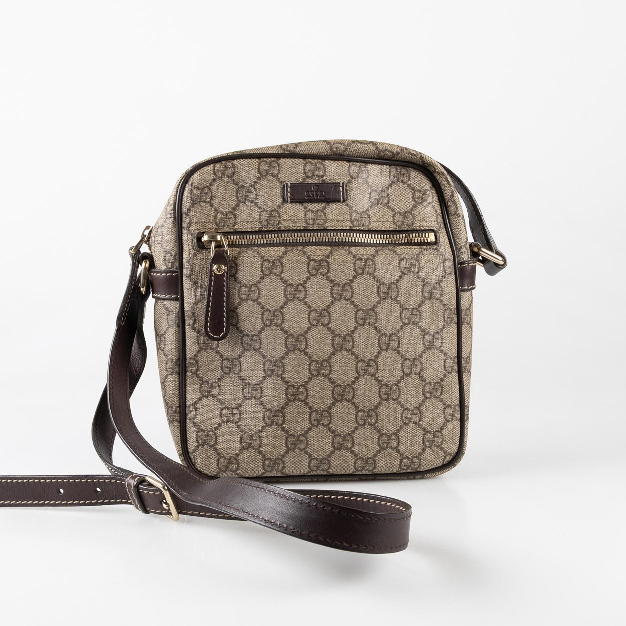 with brown leather detail. Interior with an open side compartment. Marked® GUCCI made in italy and 233268 525040. Approx. 18.5x21x7 cm. Dustbag included.