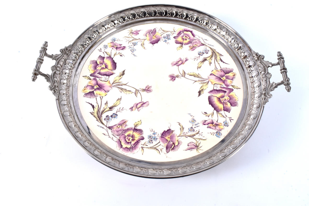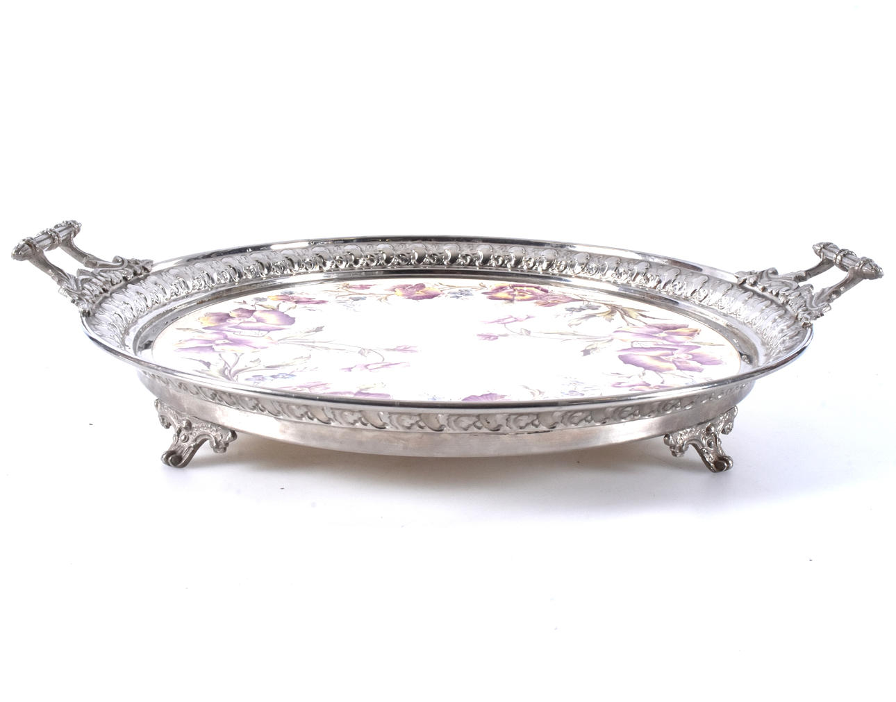 4393928. A tray, flintware, with metal frame, Rörstrand, ca 1890.