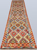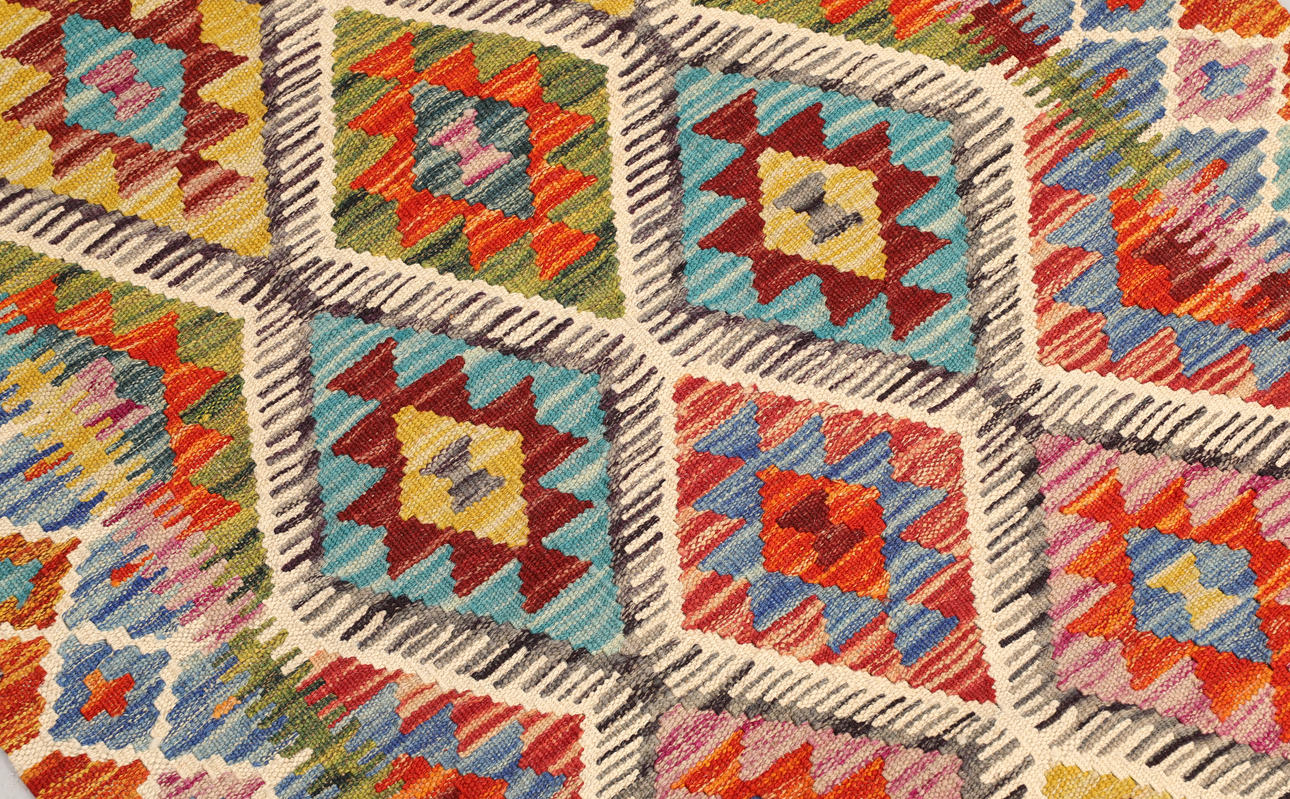 Hand-woven classic kelim in gallery model. The center field has repeated rhombus patterns in several colors, framed by smaller rhombuses along the edges.
