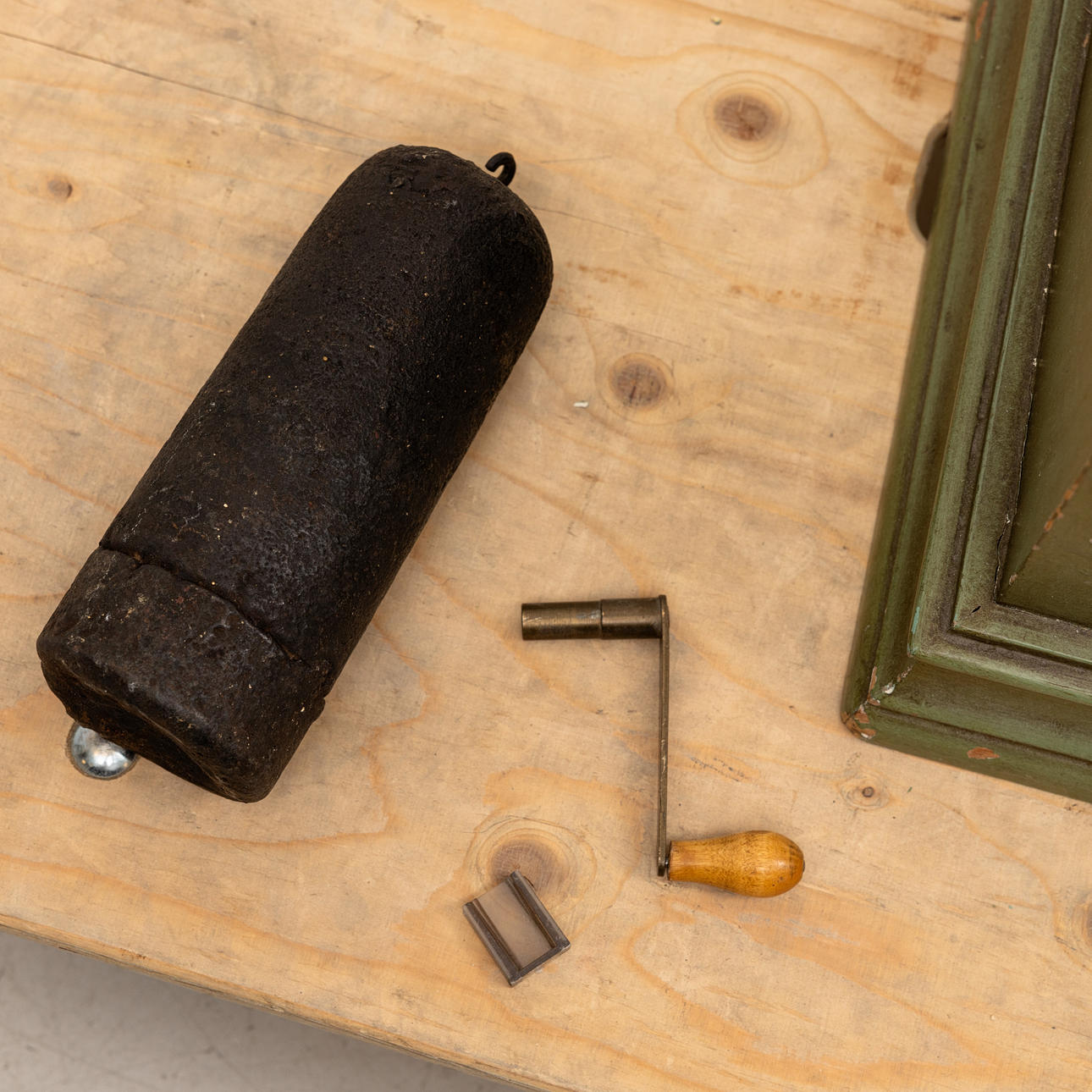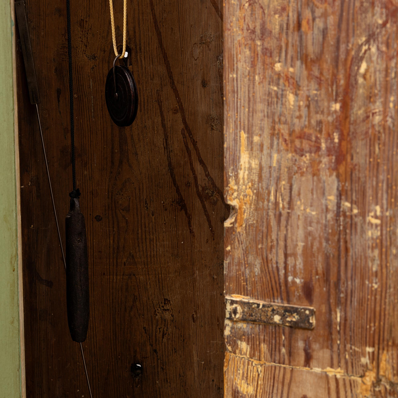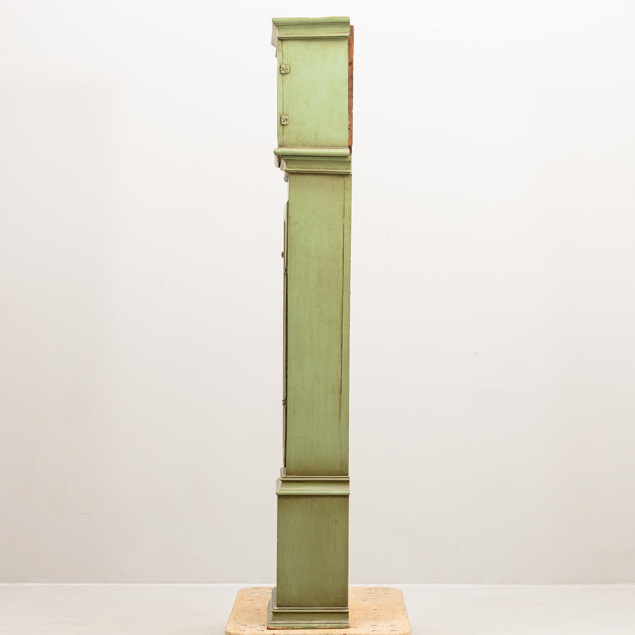 Green painted with underlying color, straight shape. Solder, pendulum, crank are available. Length 41, width 26, height 195 cm.