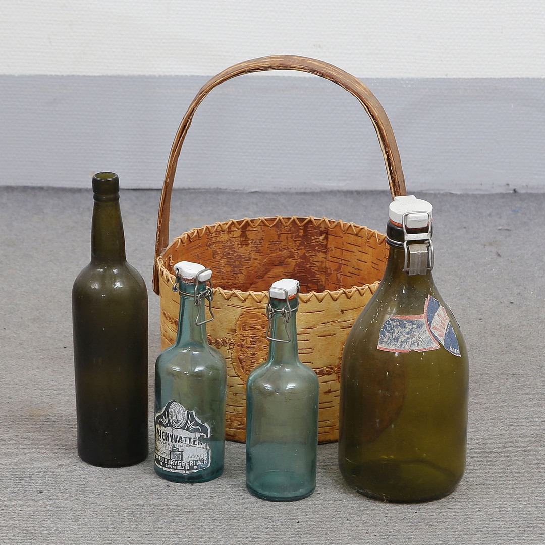 4395476. 3 BASKETS AND 4 OLDER DRINKING BOTTLES.