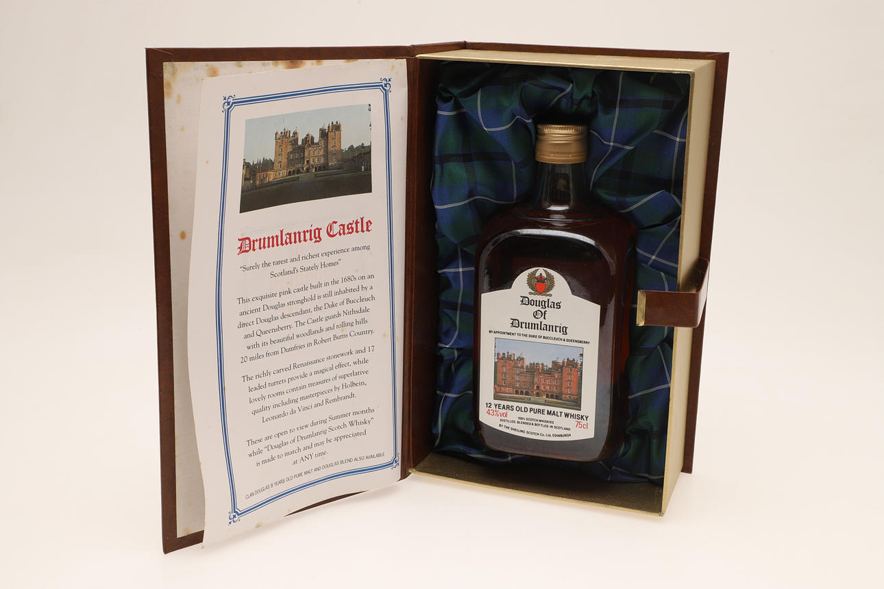 A single bottle of Douglas of Drumlanrig 12 Years Old Malt Whisky, 750ml and in a presentation box. Bottle 20.5cms high, box 27cms by 17cms