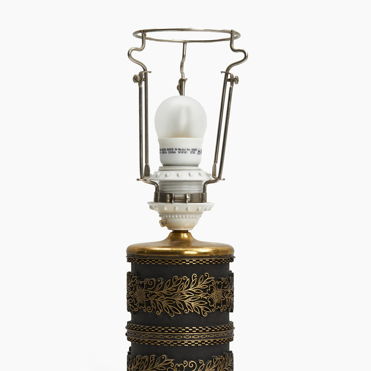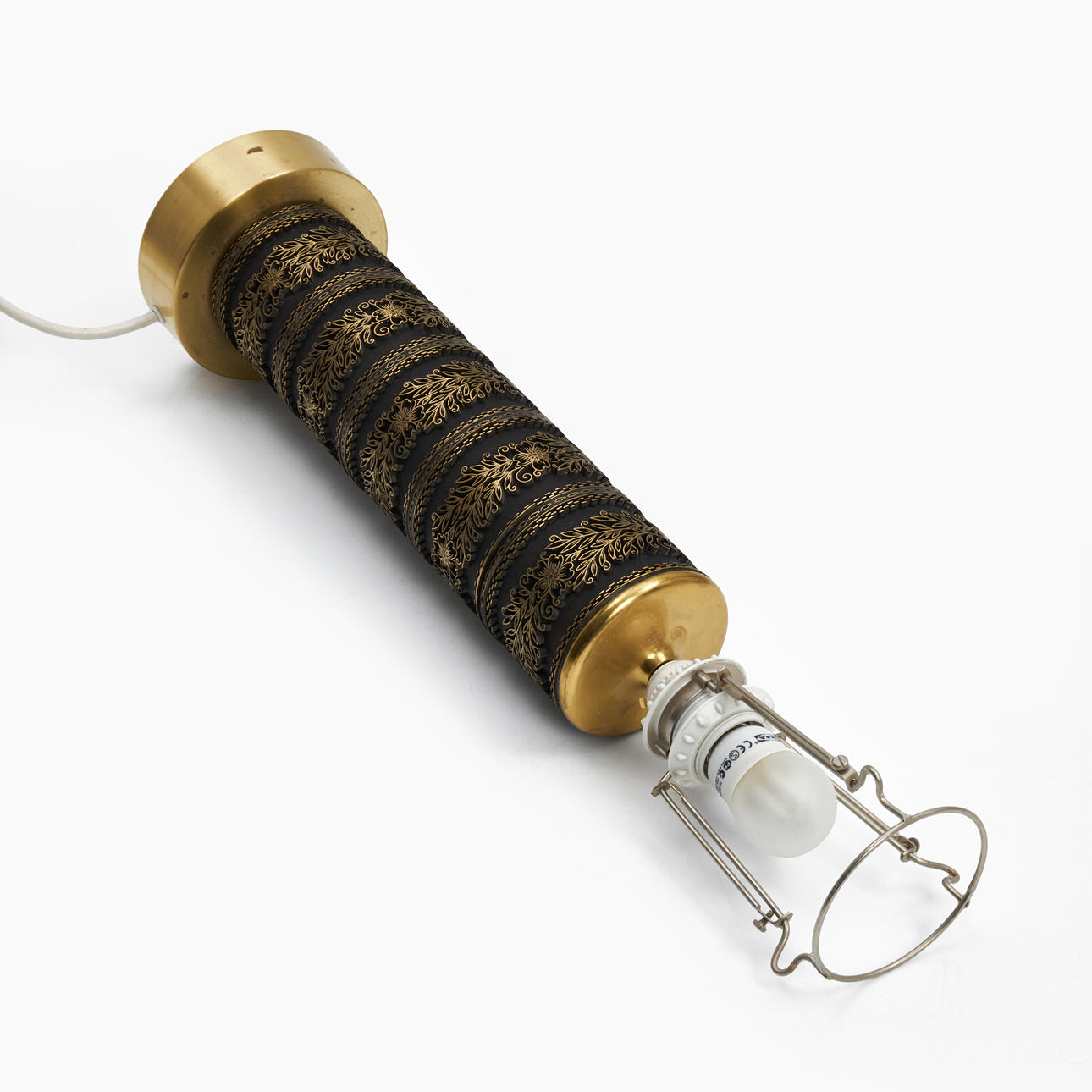 TABLE LAMP, Chinese wallpaper roll mounted on brass base.