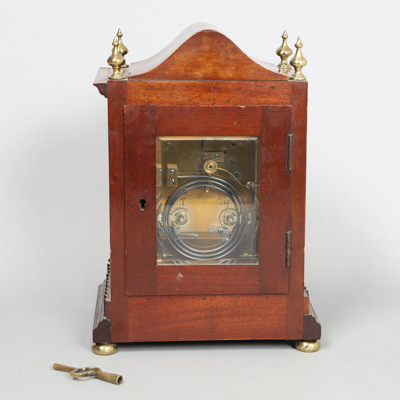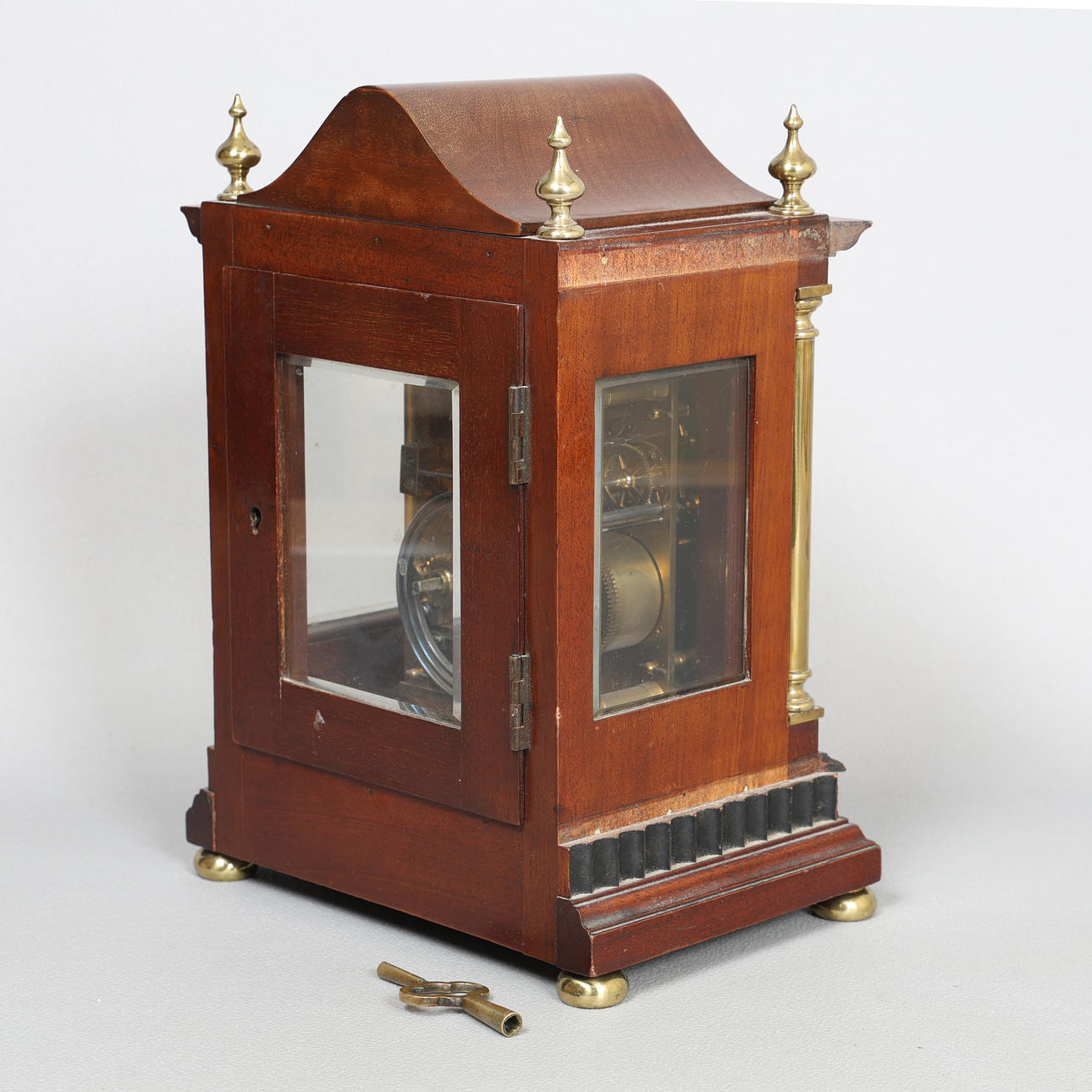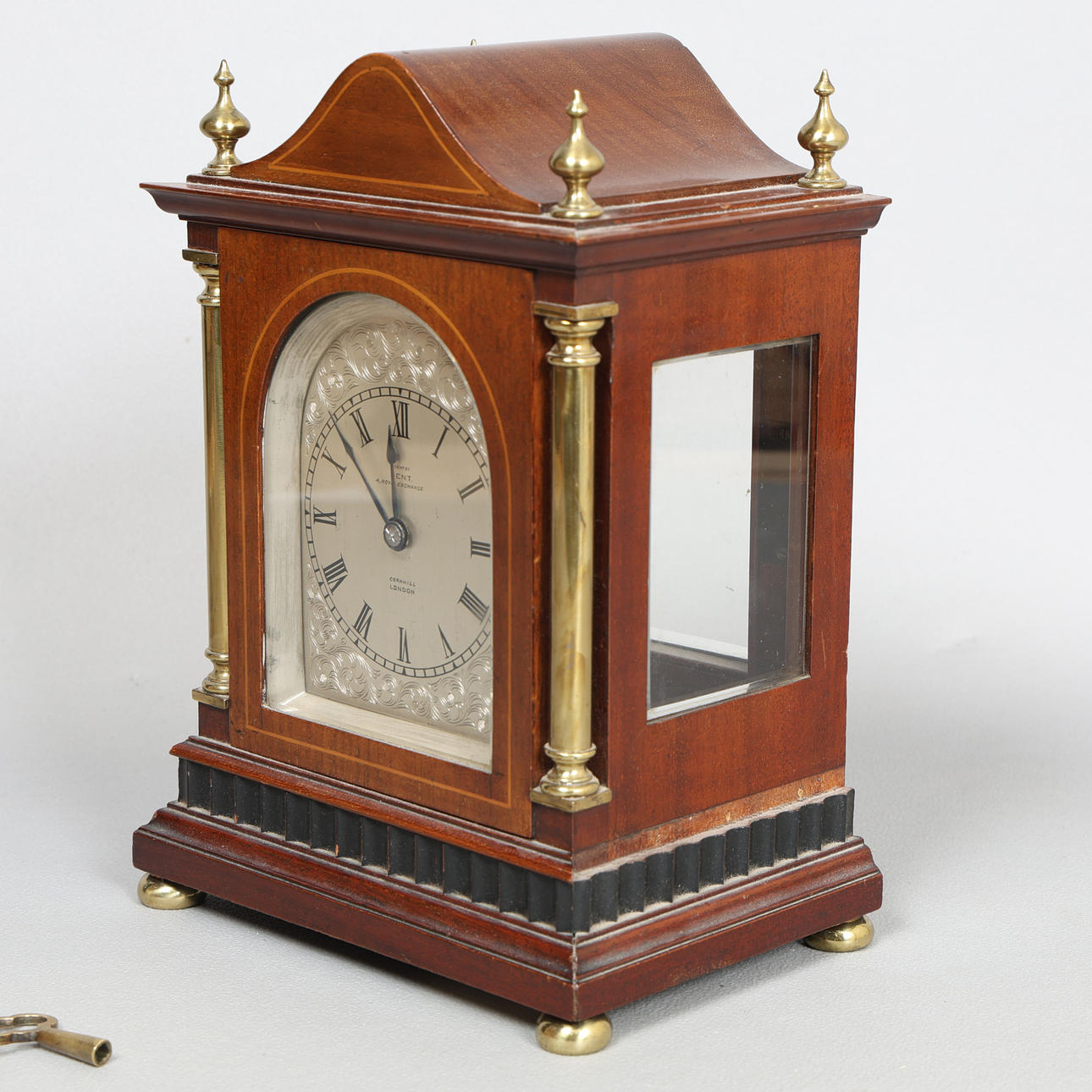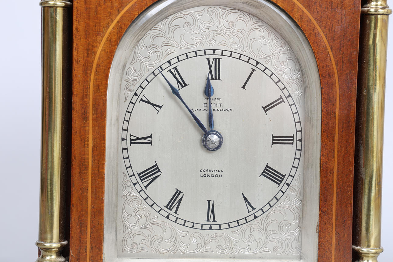The architectural case with arched pediment and four brass finials, the arched glazed door flanked by two brass columns, the silvered dial with Roman numerals signed "EXAM'D BY DENT 4 ROYAL EXCHANGE CORNHILL LONDON", raised on four squat brass bun feet, 17cm wide, 23.5cm high, 12cm deep.