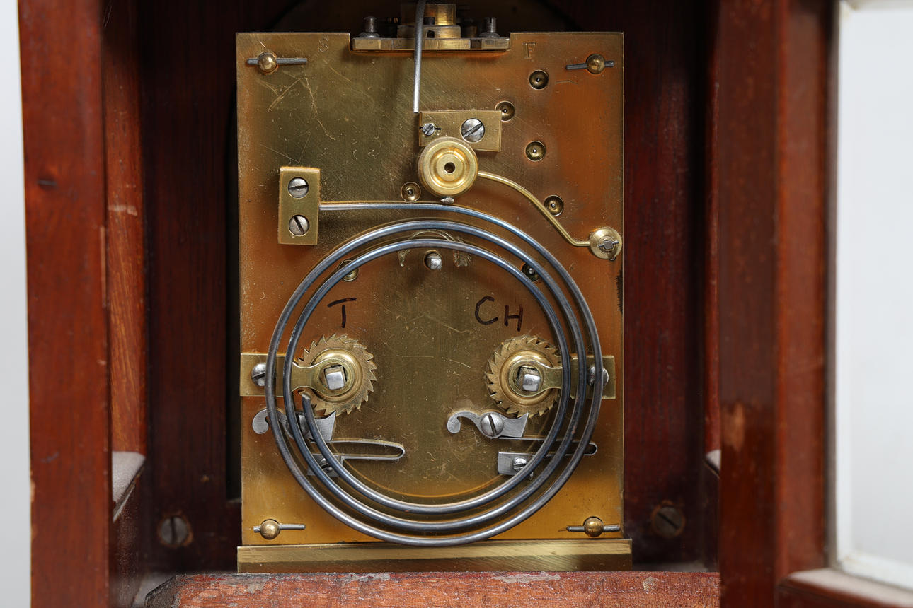 4396445. A MAHOGANY MANTEL CLOCK EXAMINED BY DENT.