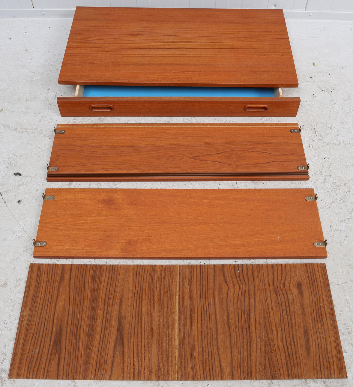 2 divisible bookshelves in teak veneer, 2 sub-cabinets with a total of 3 sliding doors and 4 drawers.