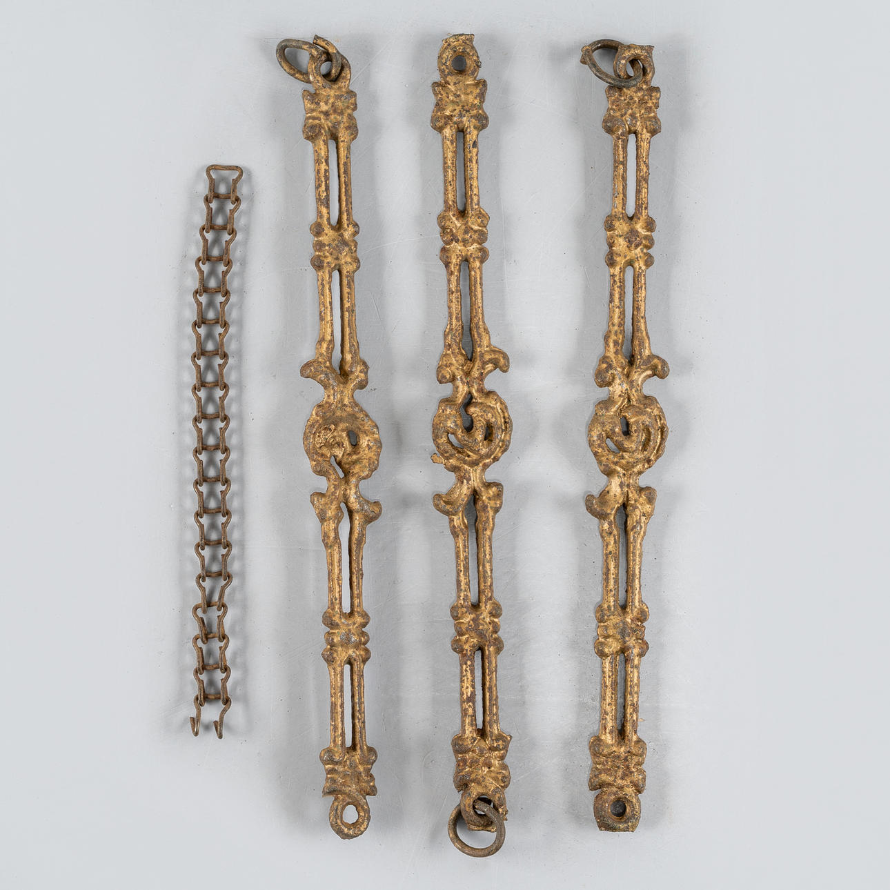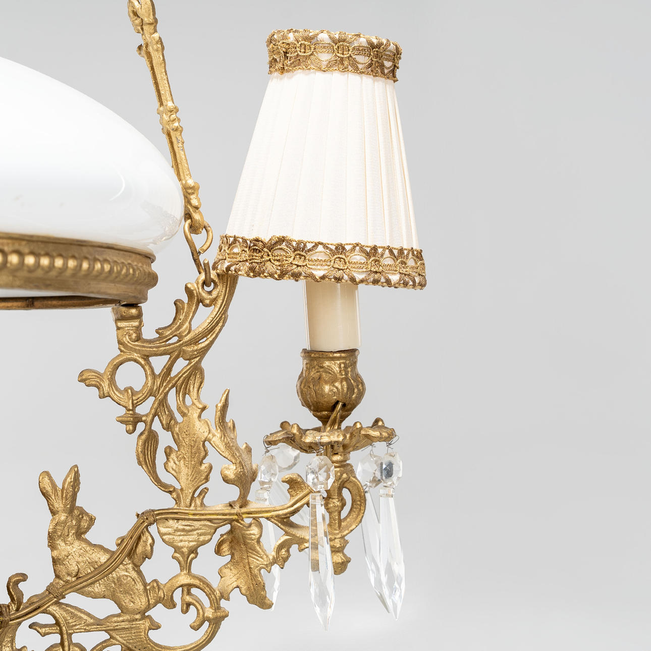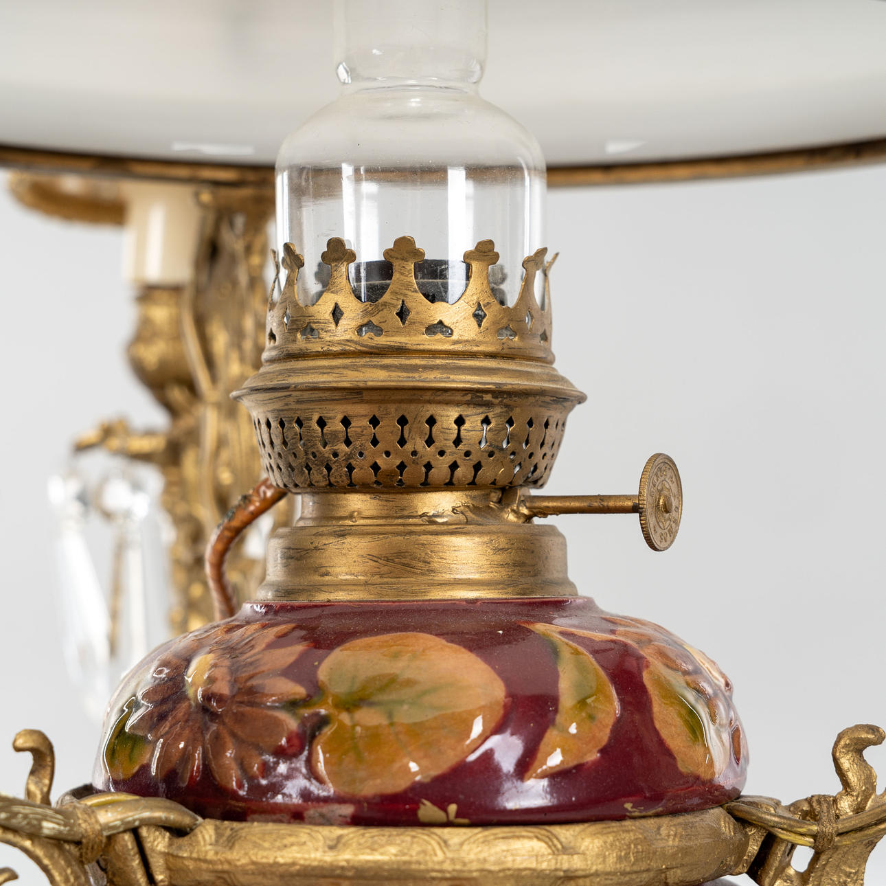 Made of bronzed metal. With 3 electric light points and kerosene burner. Cup made of white glass mass.