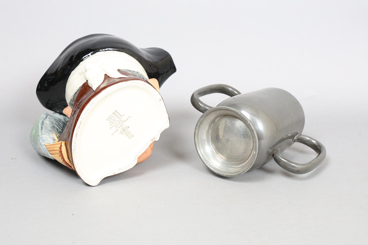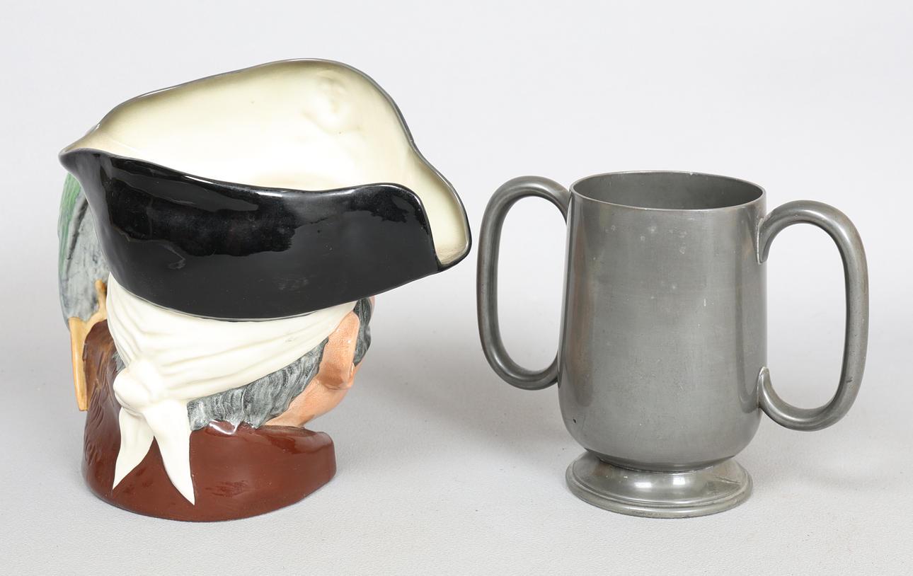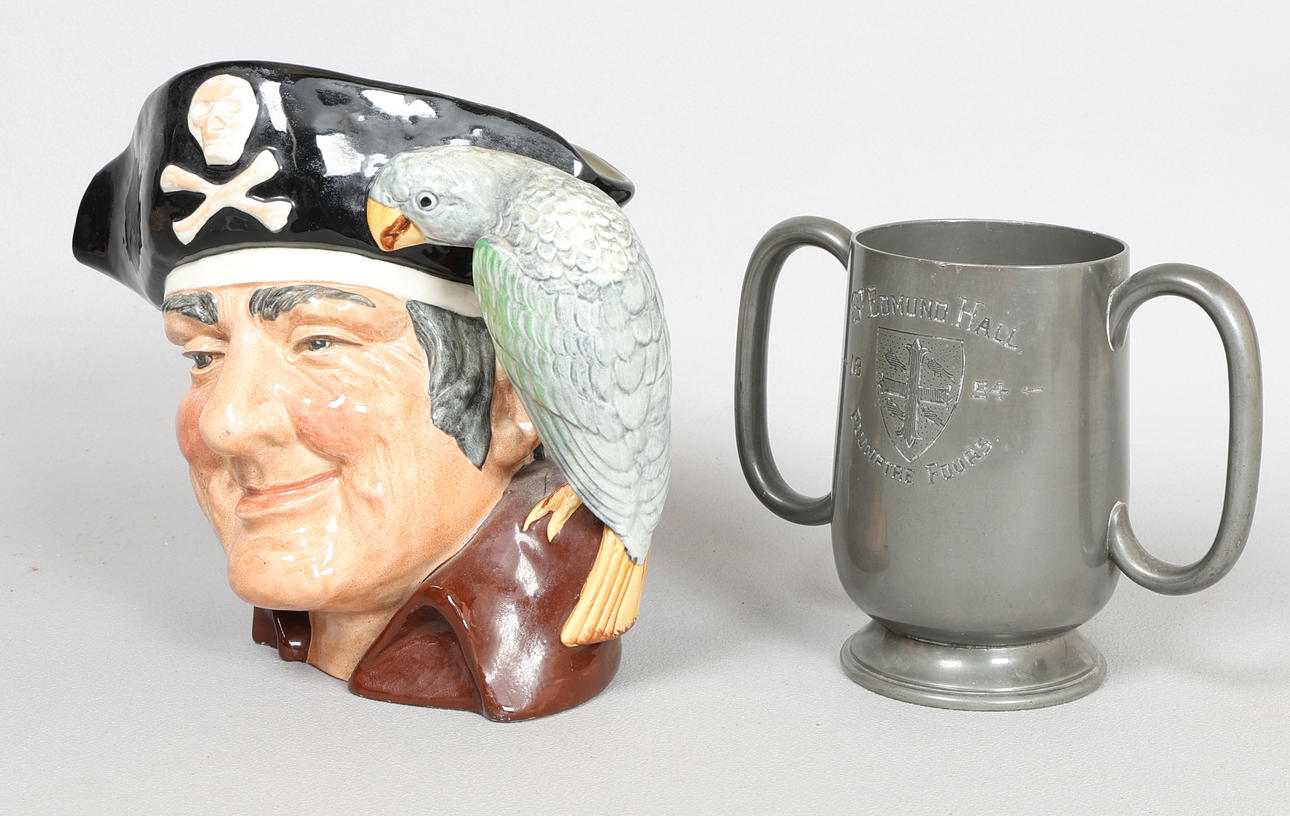 A 'LONG JOHN SILVER' TOBY JUG & A PEWTER TWIN-HANDLED CUP (2).