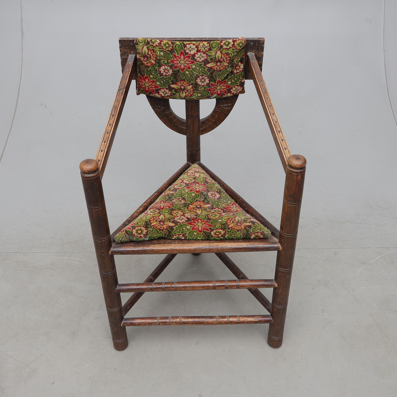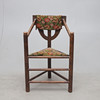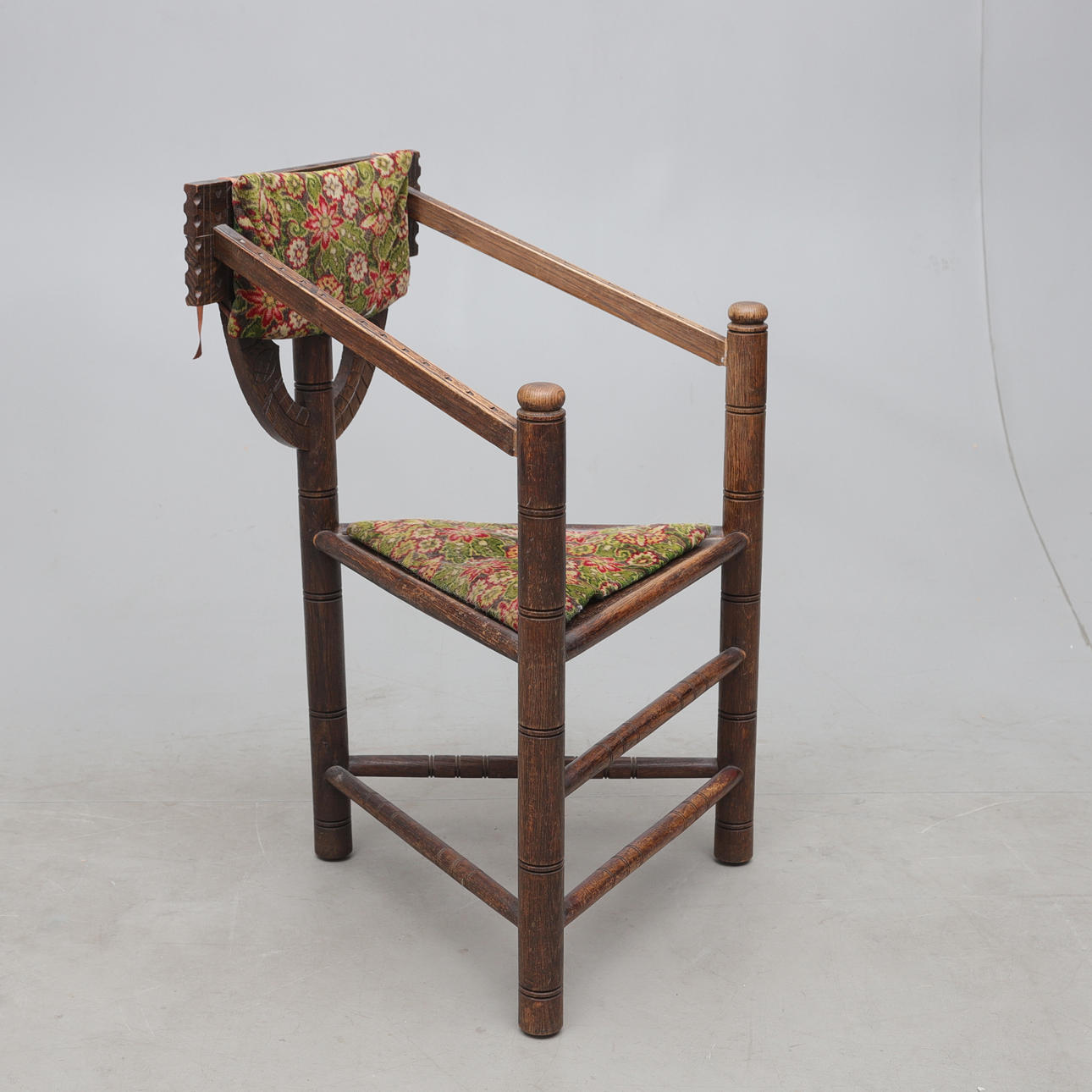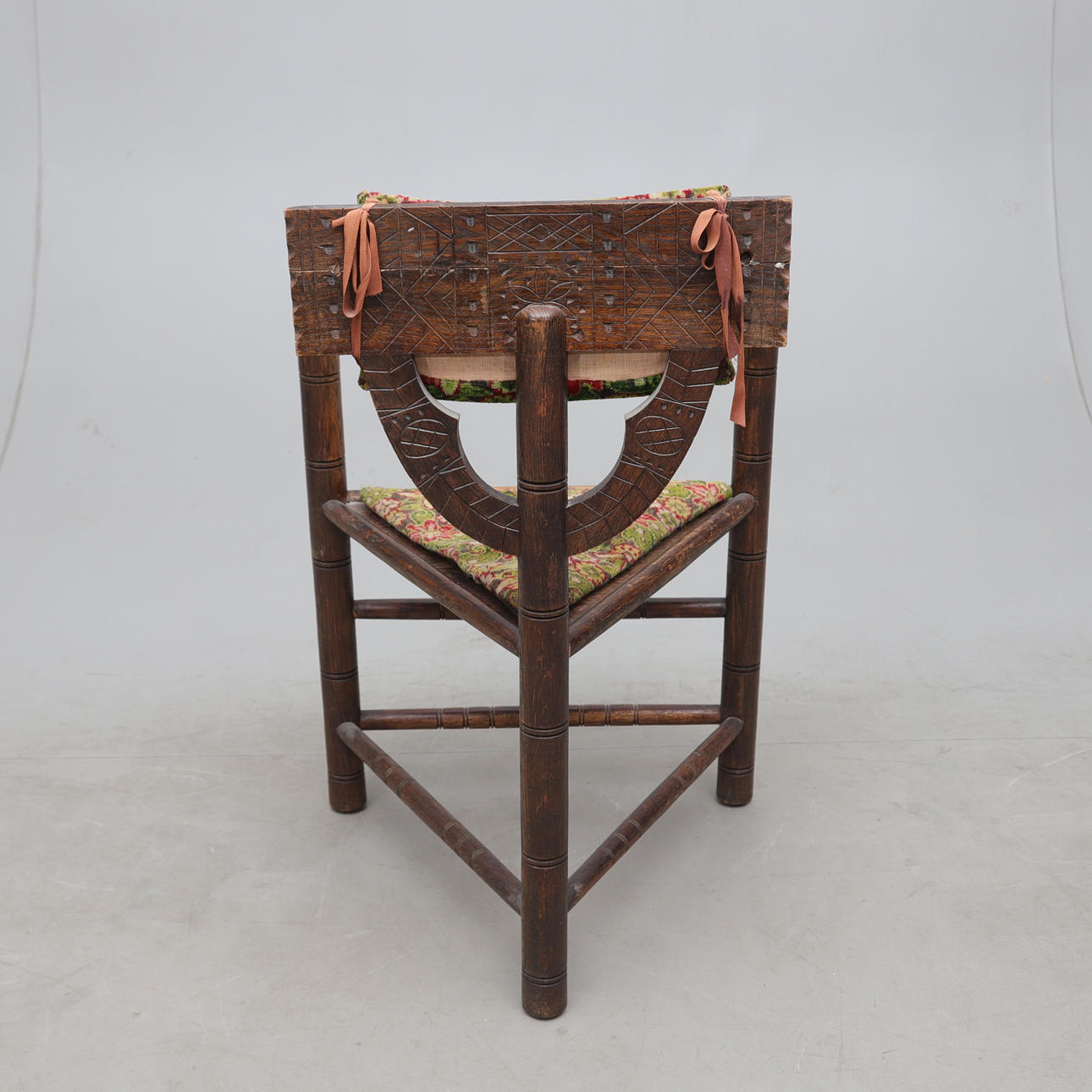 Stained oak, cut decor. Loose upholstered seats.Height approx 87, seat height 45, width 48, length 56cm.