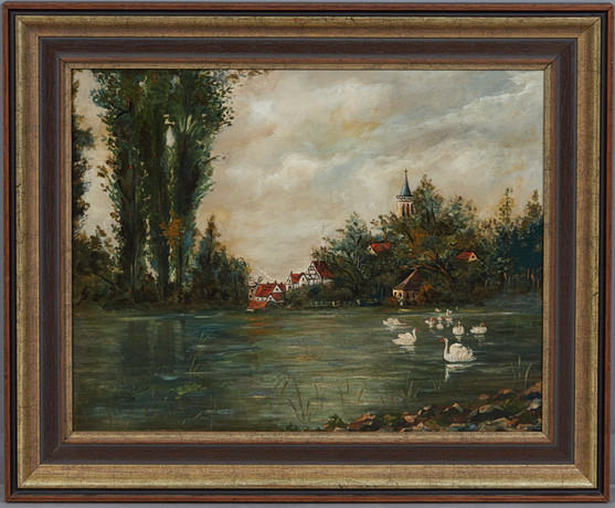4397682. OIDENTIFIERAD KONSTNÄR. Farm with figurines and swans, oil on canvas, signed A Vickery.