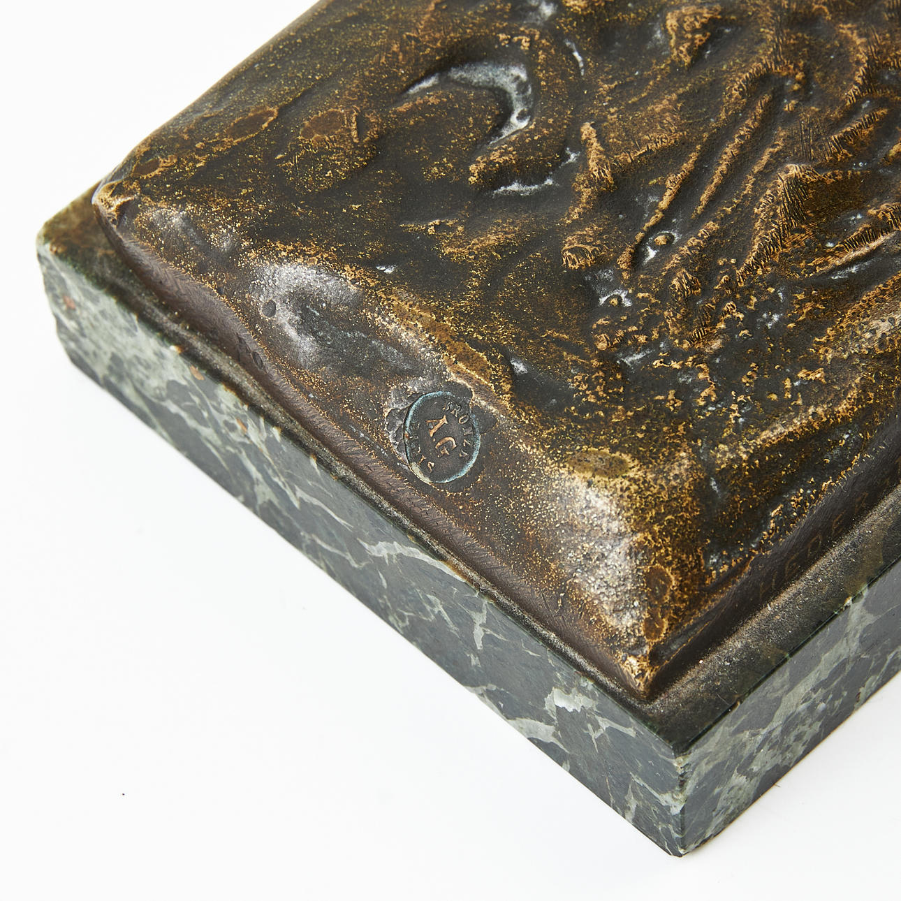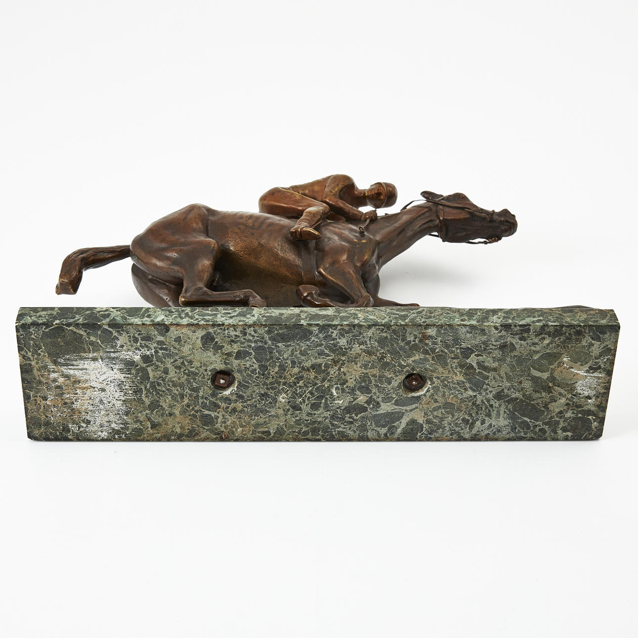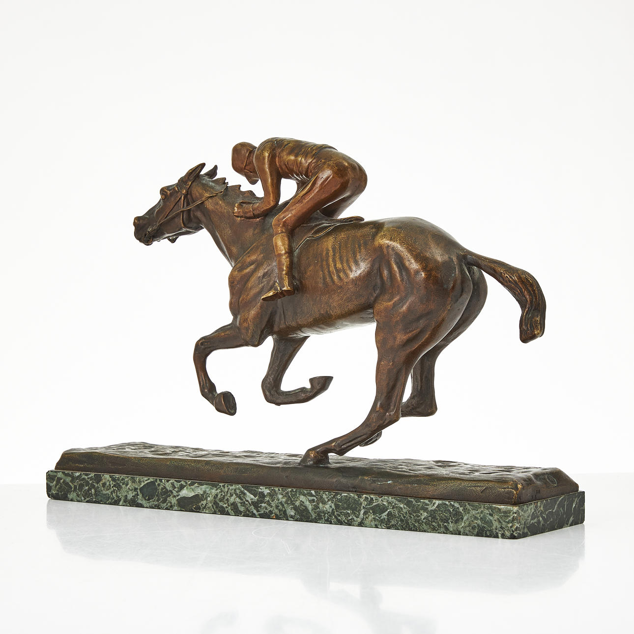 Mounted on stone plinth, marked “Bronze AG Paris”, engraved on the plinth “Honorary Award to the trainer of the victorious horse at the first Swedish Derby Jägersro 30.6 1918". height 24, length 36x9 cm