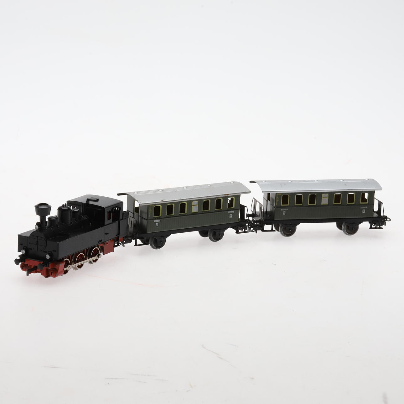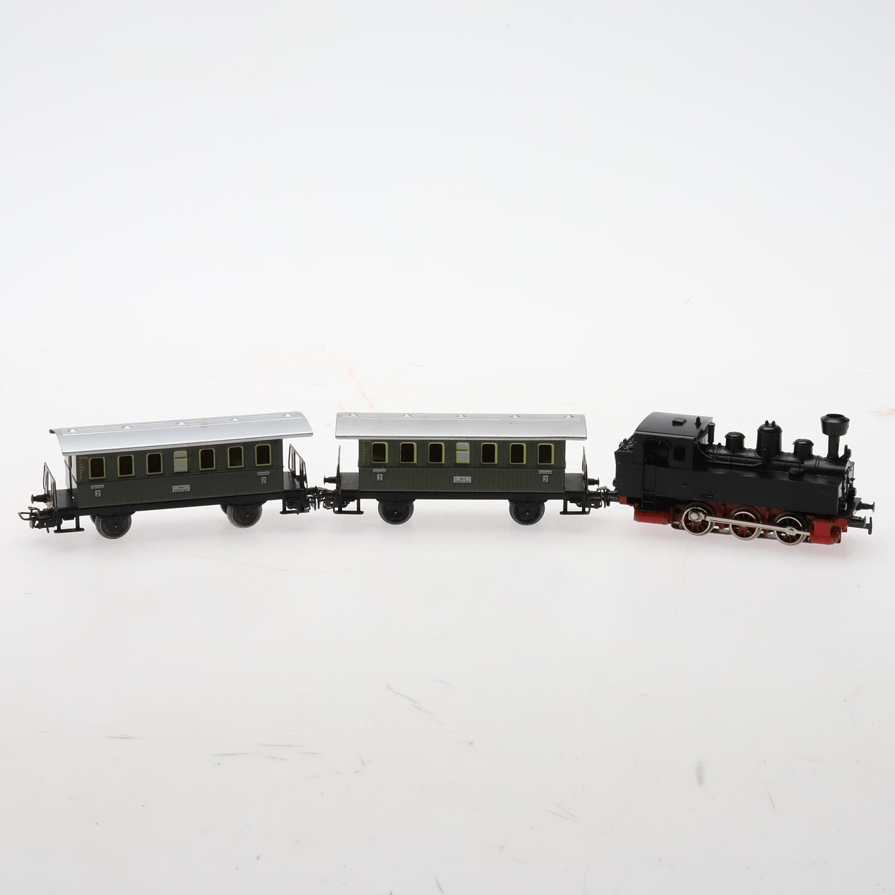 Märklin set consisting of 1 locomotive, 3 carriages and 14 rail parts.