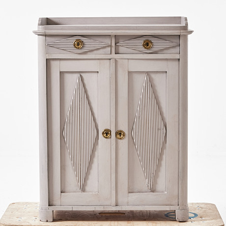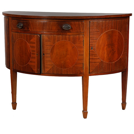 Of bow fronted form with a cross banded top above a single drawer flanked by a pair of cupboard doors, all with lion mask handles, 122cm wide 87cm high 49cm deep.