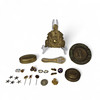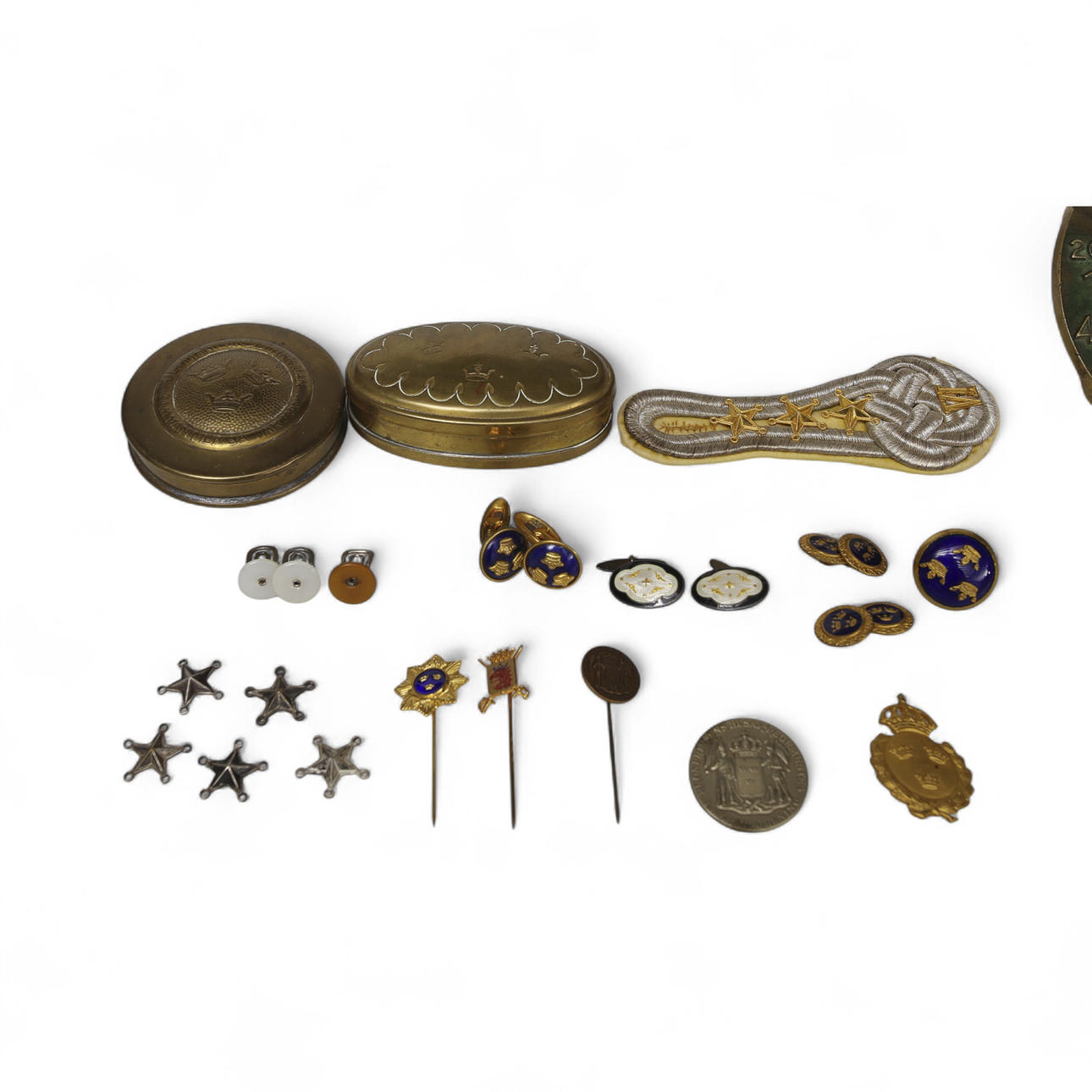 4399099. MISCELLANEOUS MILITARIA, Cap plate, shoulder flap, snuff cans, needle mark.