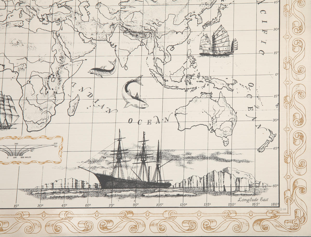 World map, print on silver plate, “The Royal Geographical Society Silver Map”.
