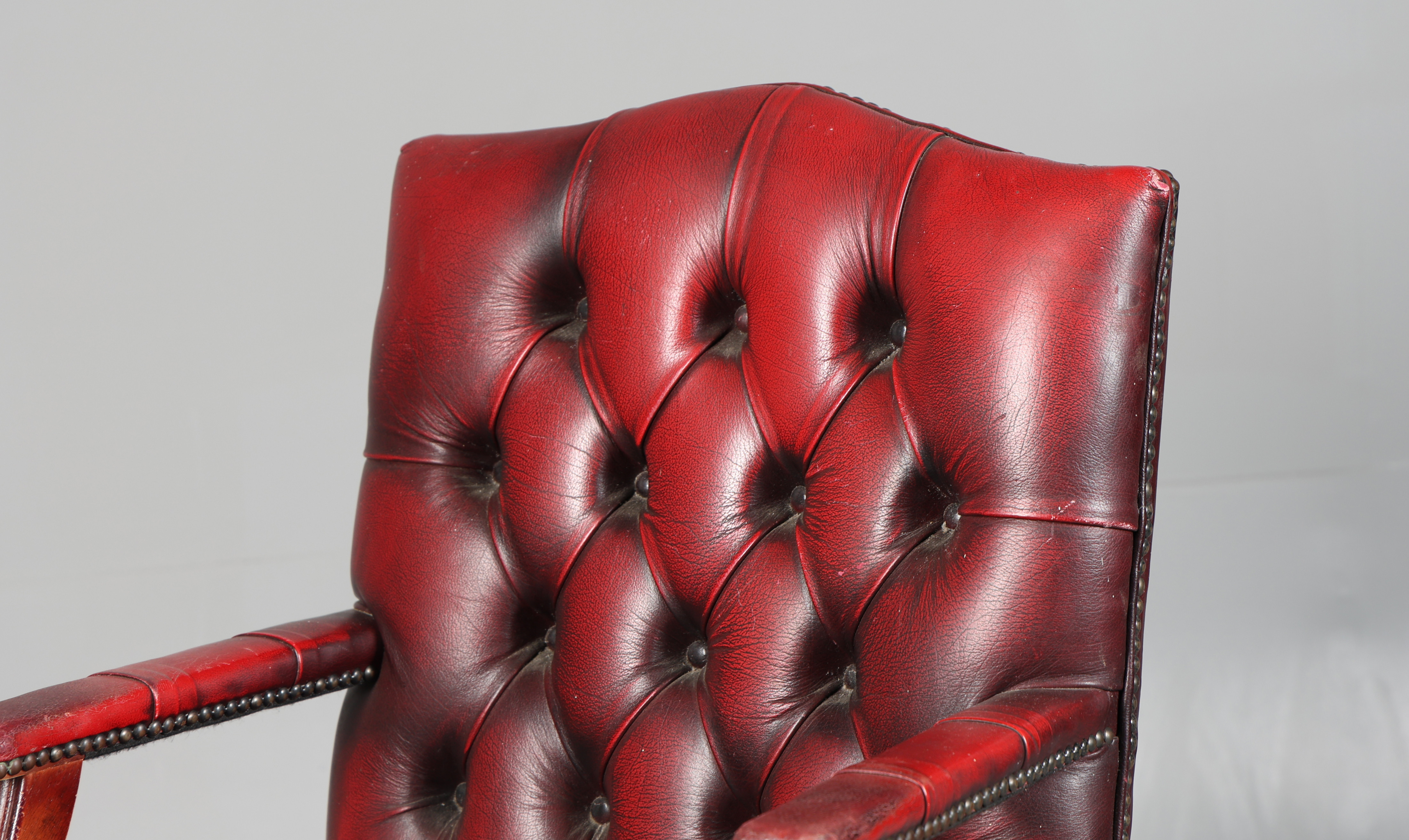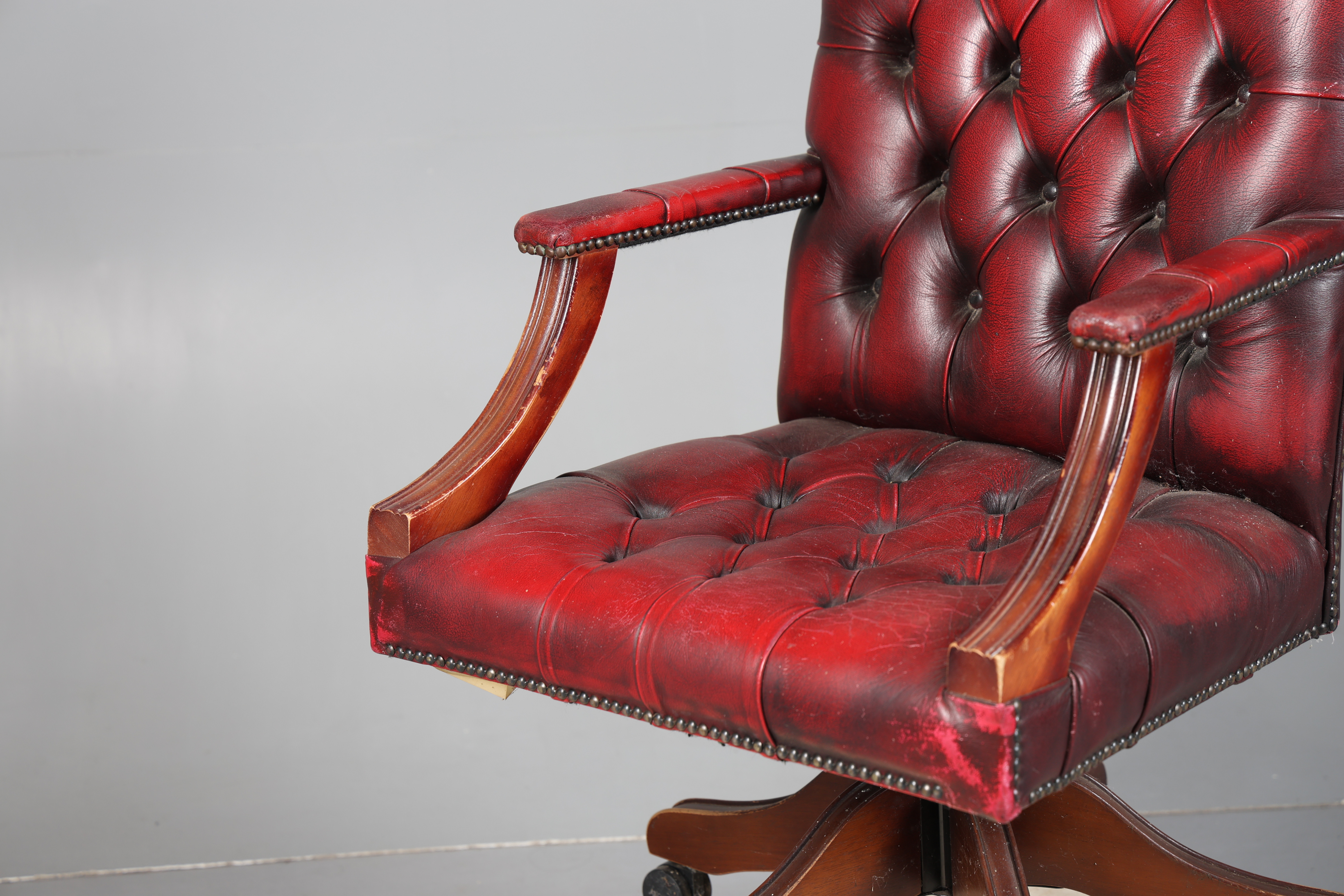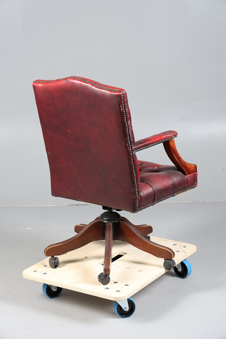 4399588. A RED LEATHER BUTTON DOWN SWIVEL DESK CHAIR.