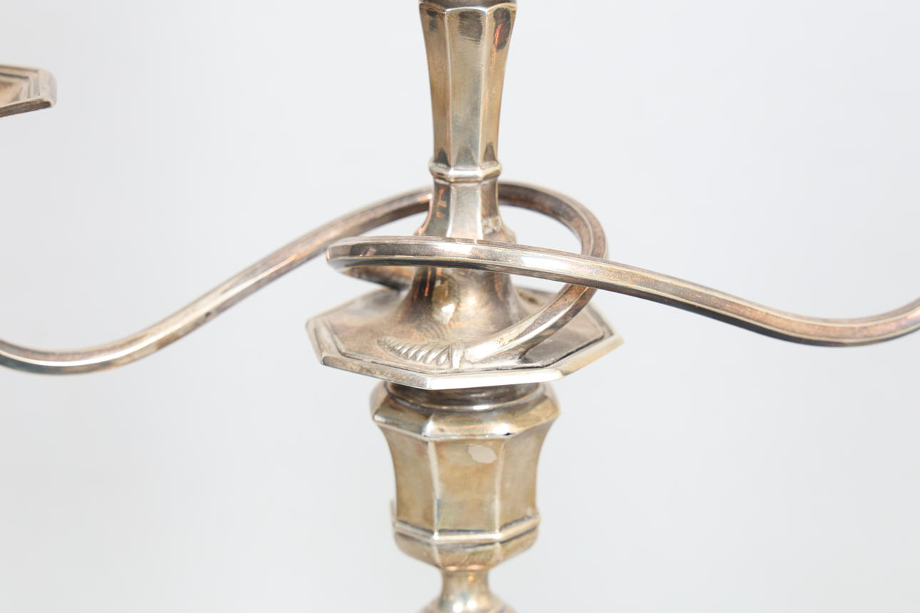 4399938. AN EDWARD VII SILVER THREE BRANCH CANDELABRA.