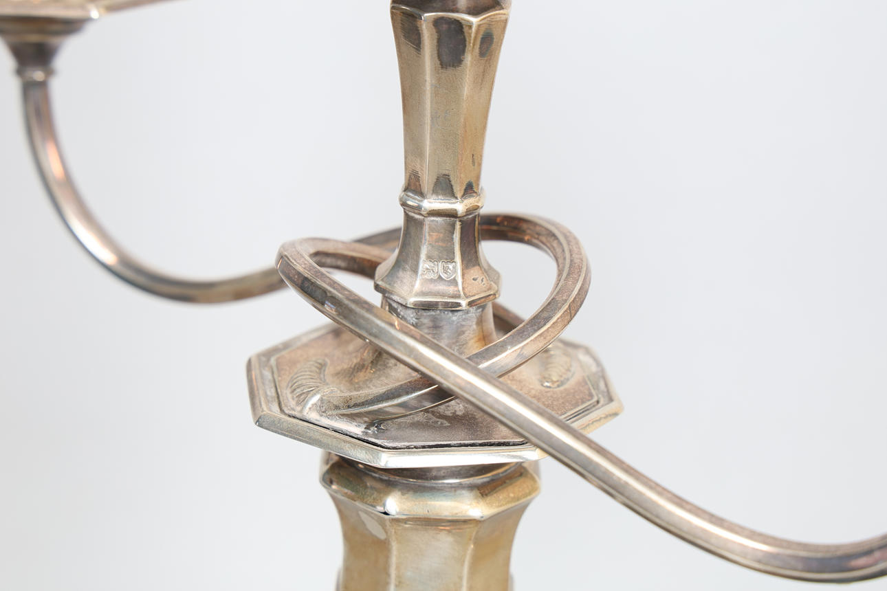 One of the sconces is detached but present, some rubbing to hallmarks, scratches and marks.