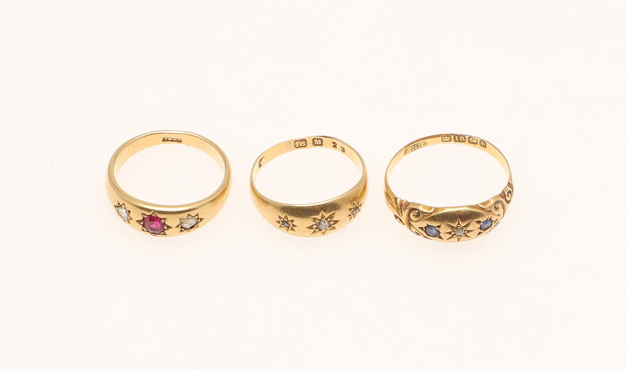 set with an oval-shaped ruby and two rose-cut diamonds, 4.1 grams, size K, a sapphire, diamond and 18ct gold gypsy ring, 2.4 grams, size O 1/2 and a diamond and 18ct gold gypsy ring, 2.9 grams, size K 1/2.