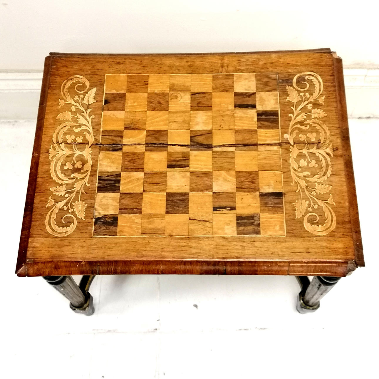 ANTIQUE CHESS BOARD TOPPED LOW TABLE.