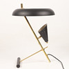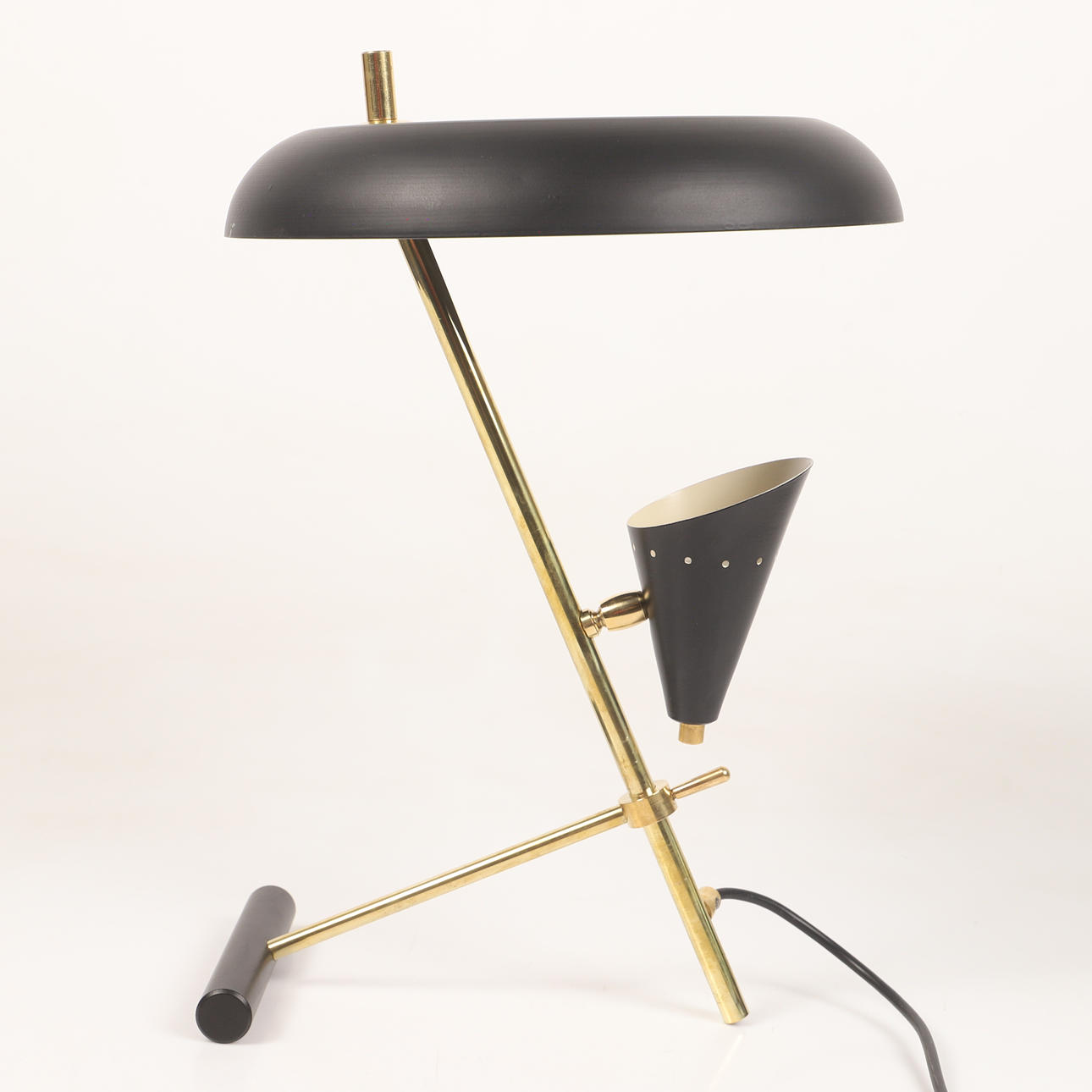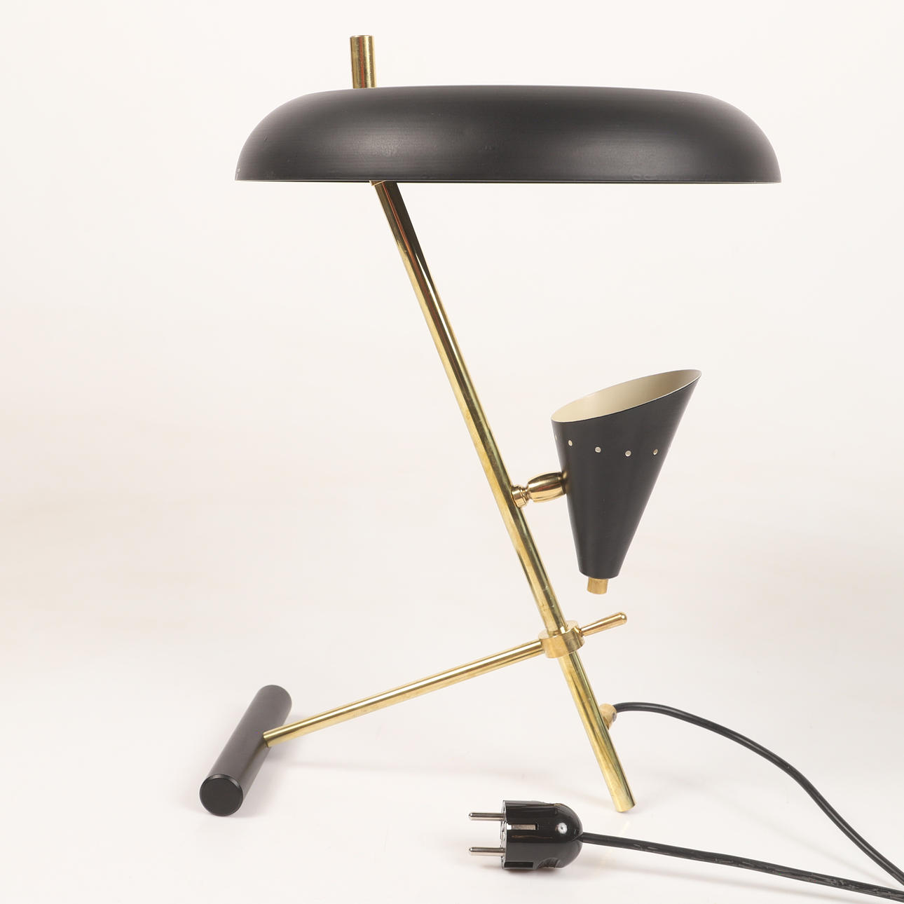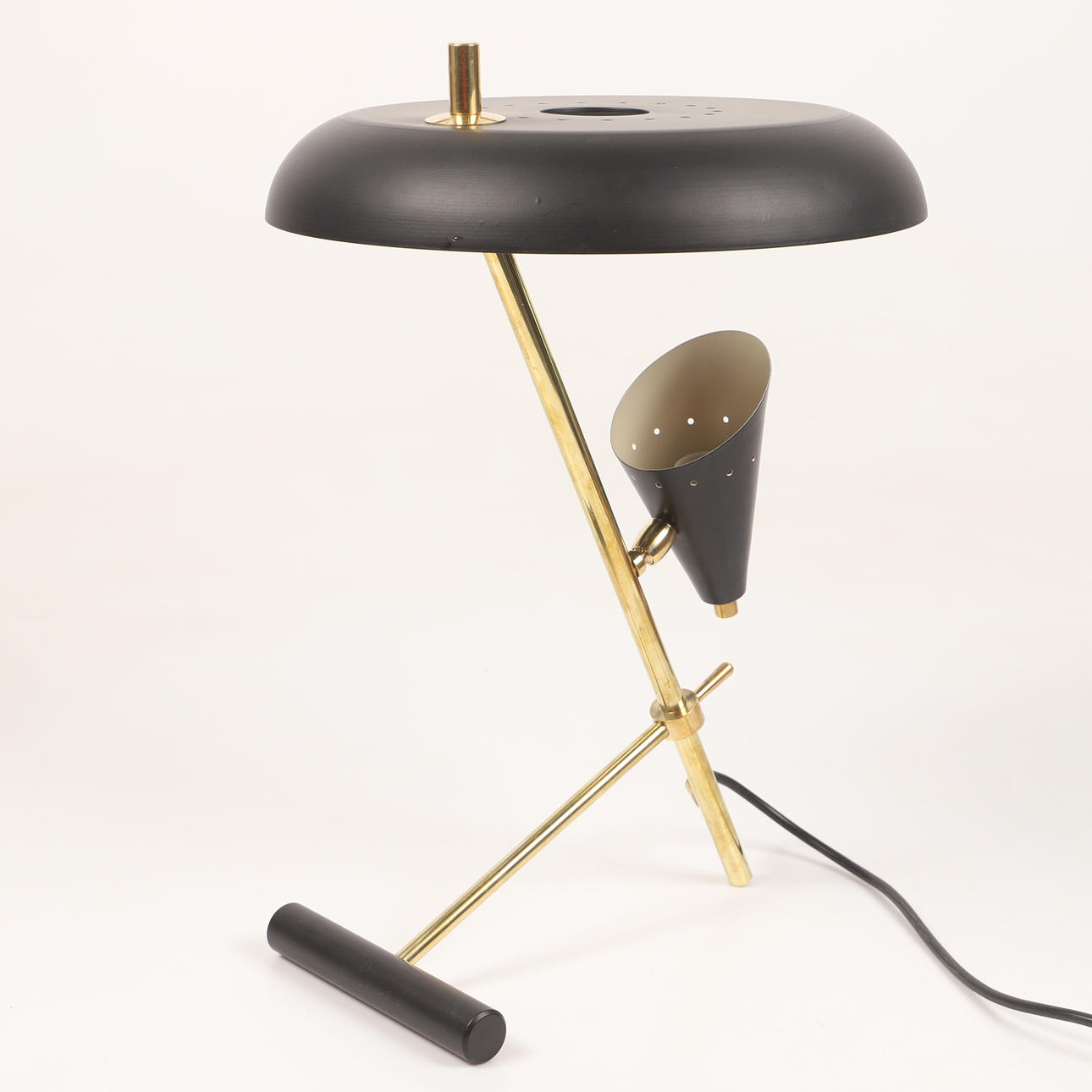Body of patinated brass, black lacquered metal screens, 1 light source, uplight Height approx. 44 cm