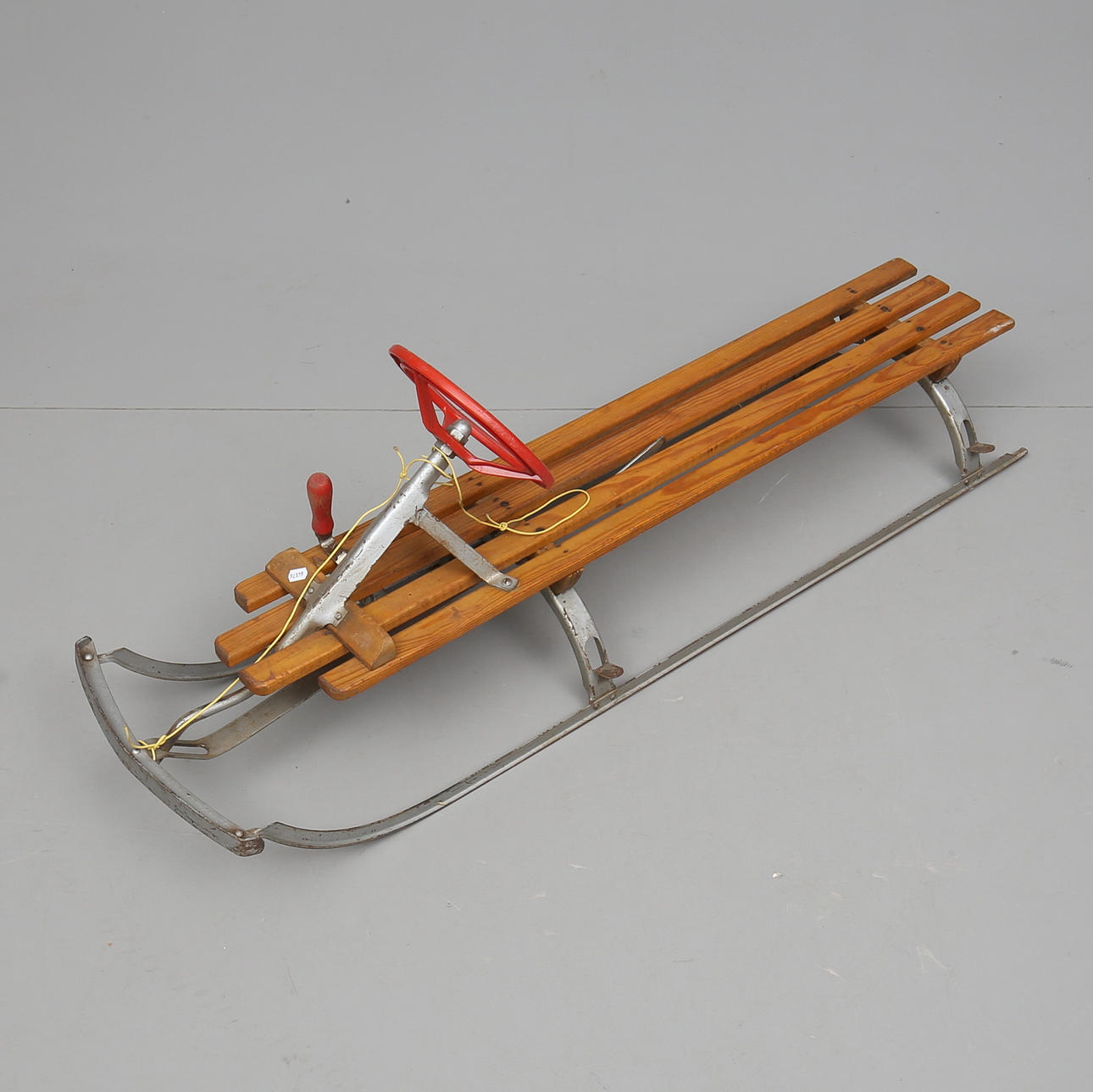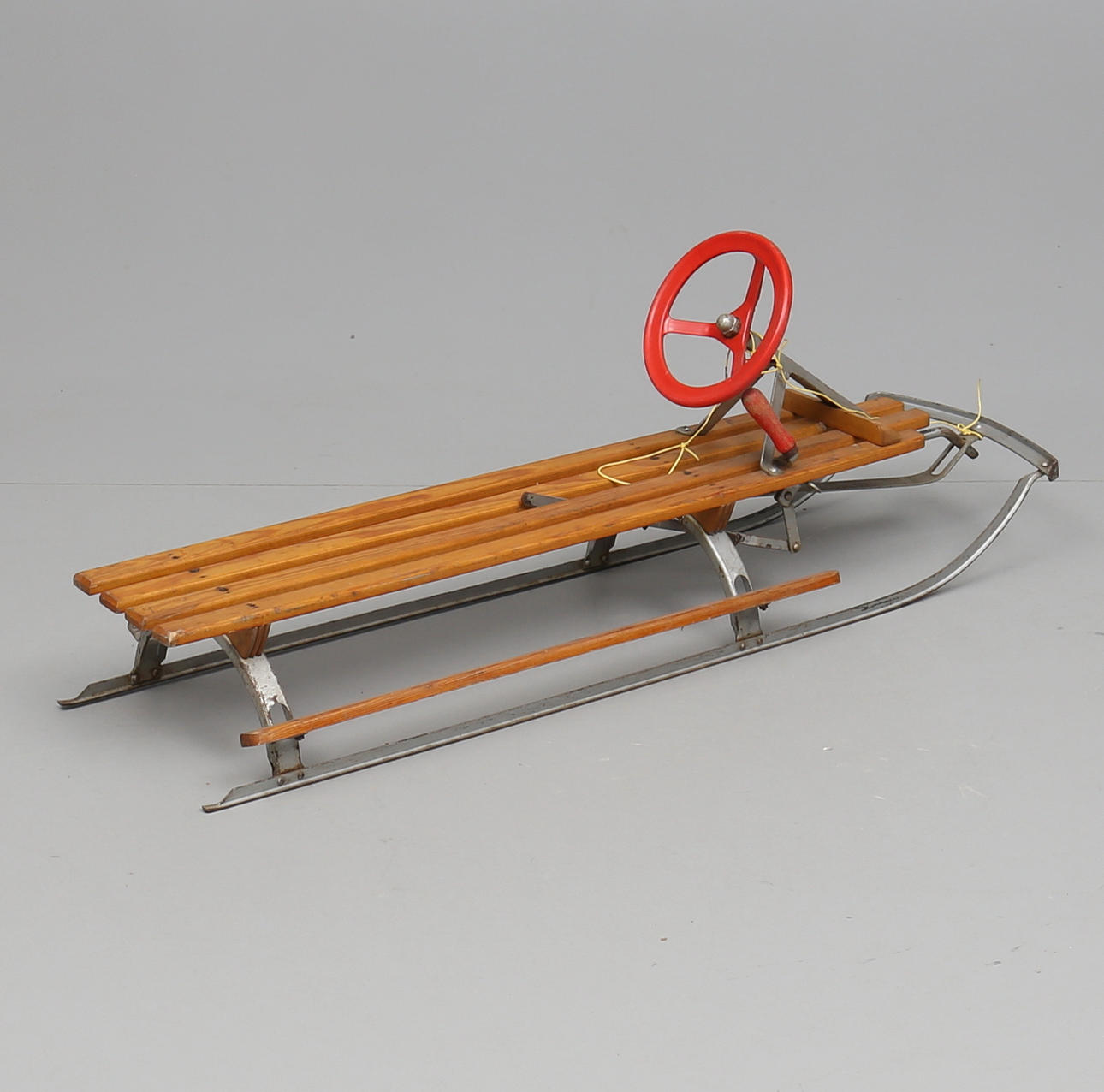 Frame of lacquered metal. Seat with wooden slats. Length about 117 cm.