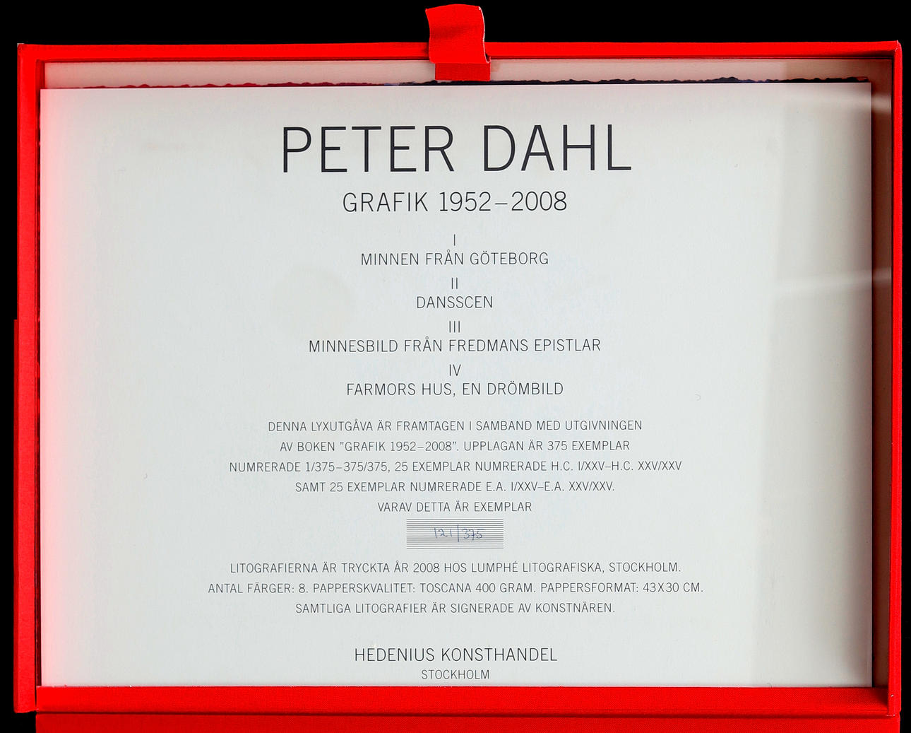 Book about the artist and four signed lithographs, in a globe-covered folder with embossed cover. Published by Hedenius Konsthandel, Stockholm, in an edition of 375 copies, this is number 121