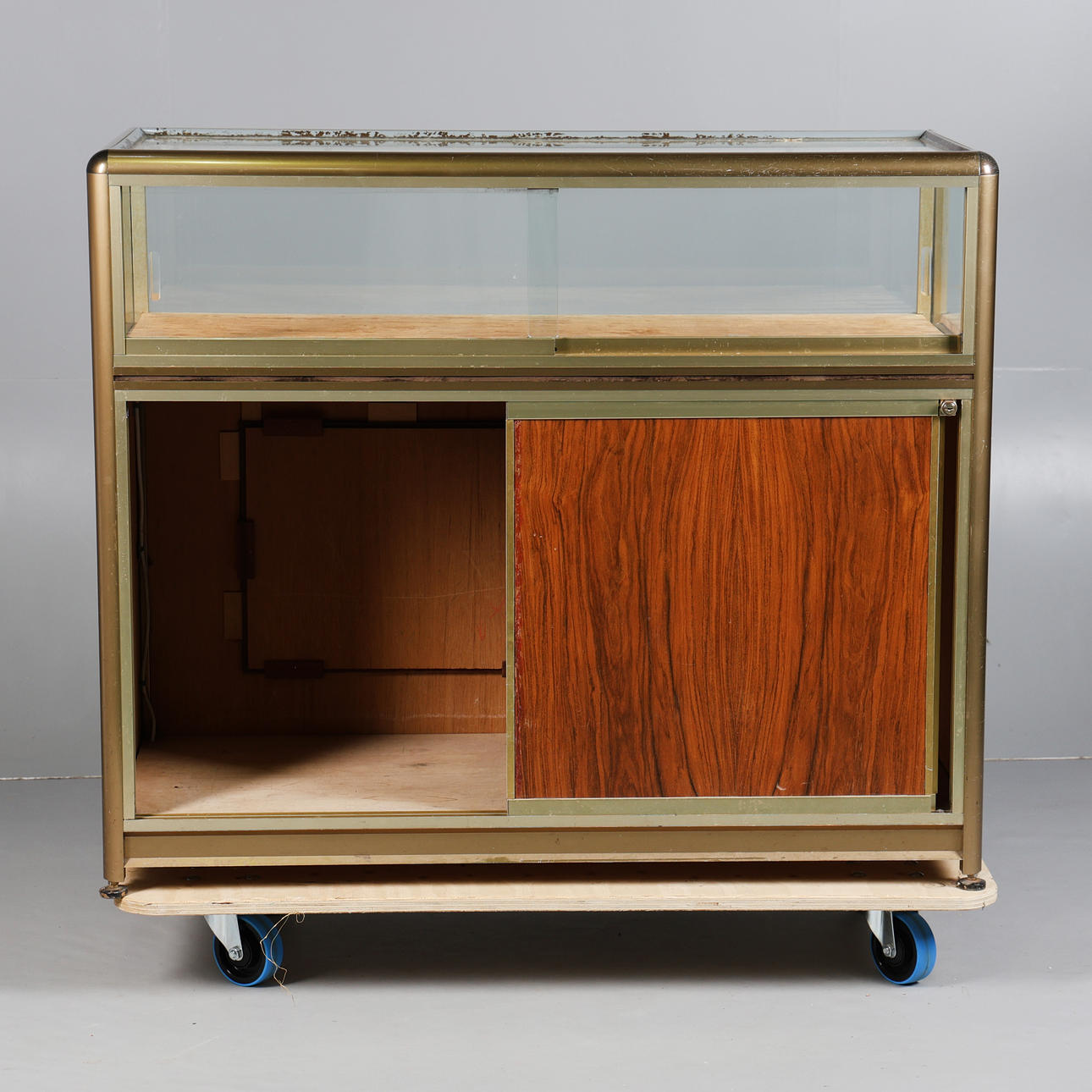 The display cabinet with glass top above a display section with glass sliding doors above a storage section with sliding doors, panel front, 100cm x 119cm x 50cm.