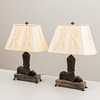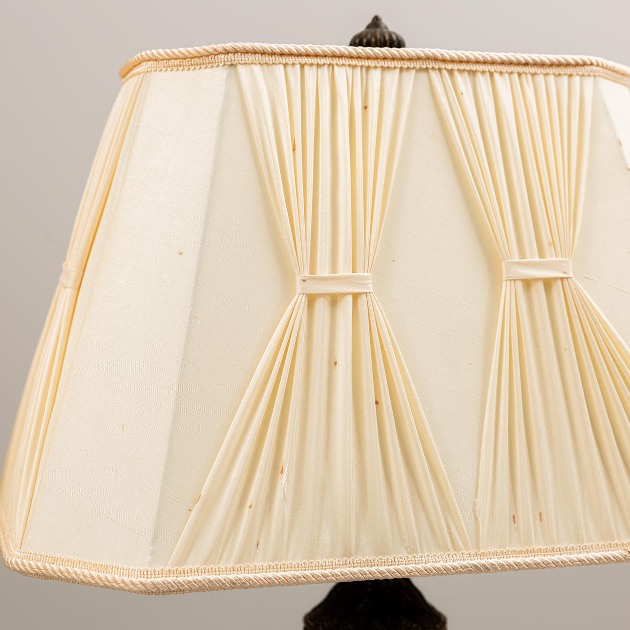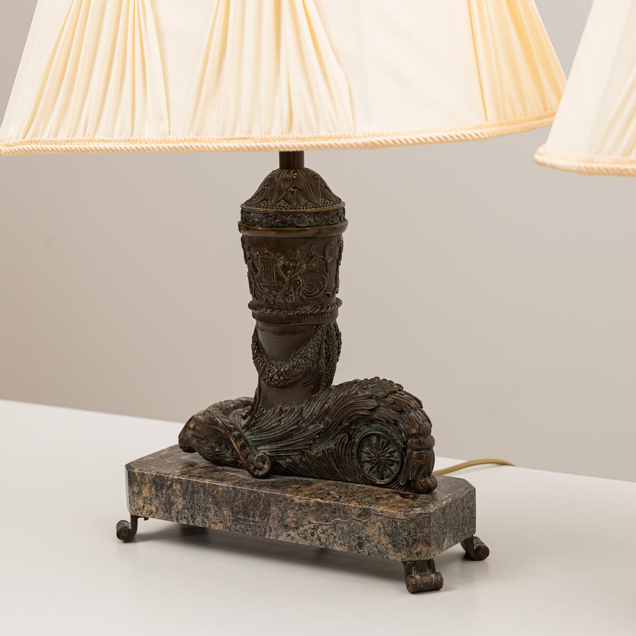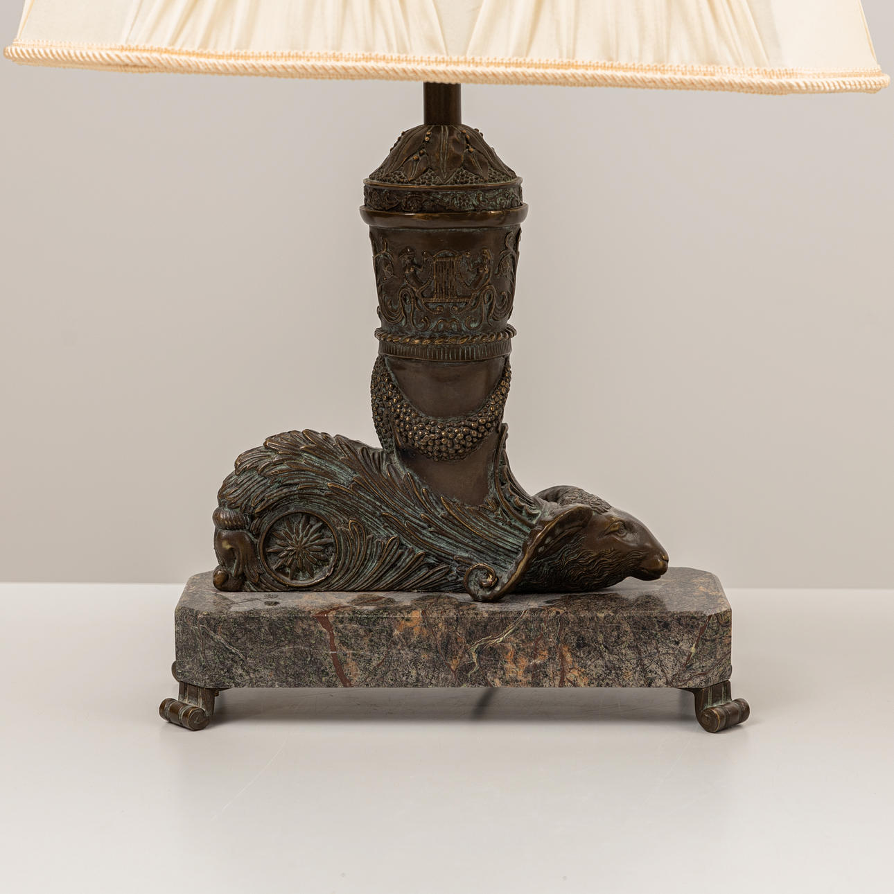 Abundance horns with ram heads, mounted on stone plinth, Octagonal lined screens included. Height approx. 58 cm.