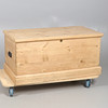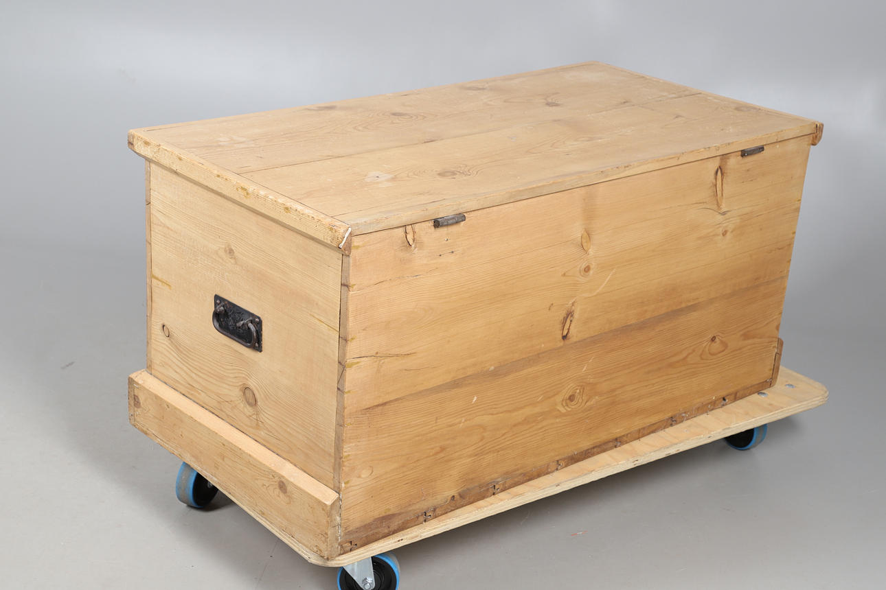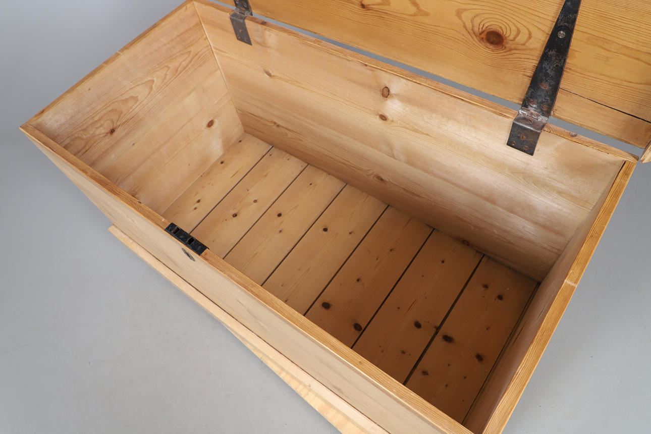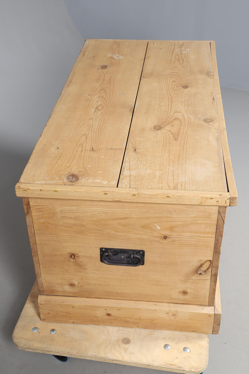 Features metal fixings and side handles. Replacement locking mechanism. No key. Height 53cm, length 110.5cm, depth 56cm.