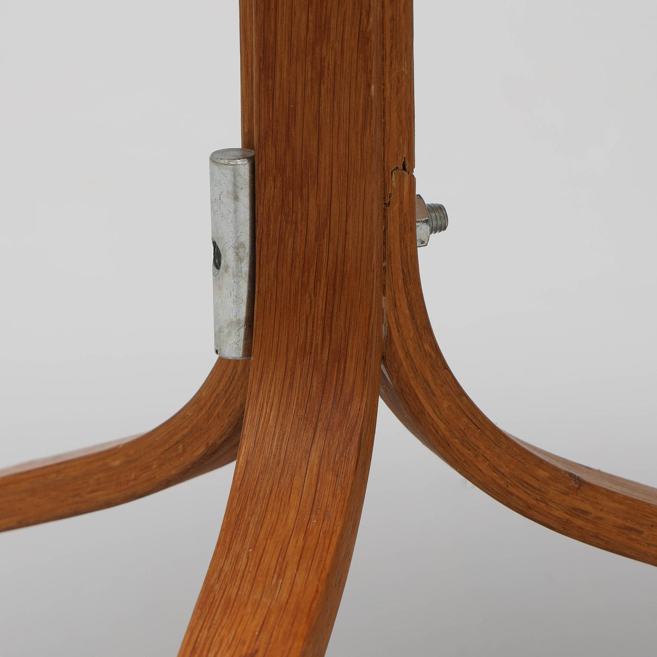 Great mending on the leg, stains and marks on tabletop.