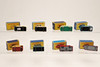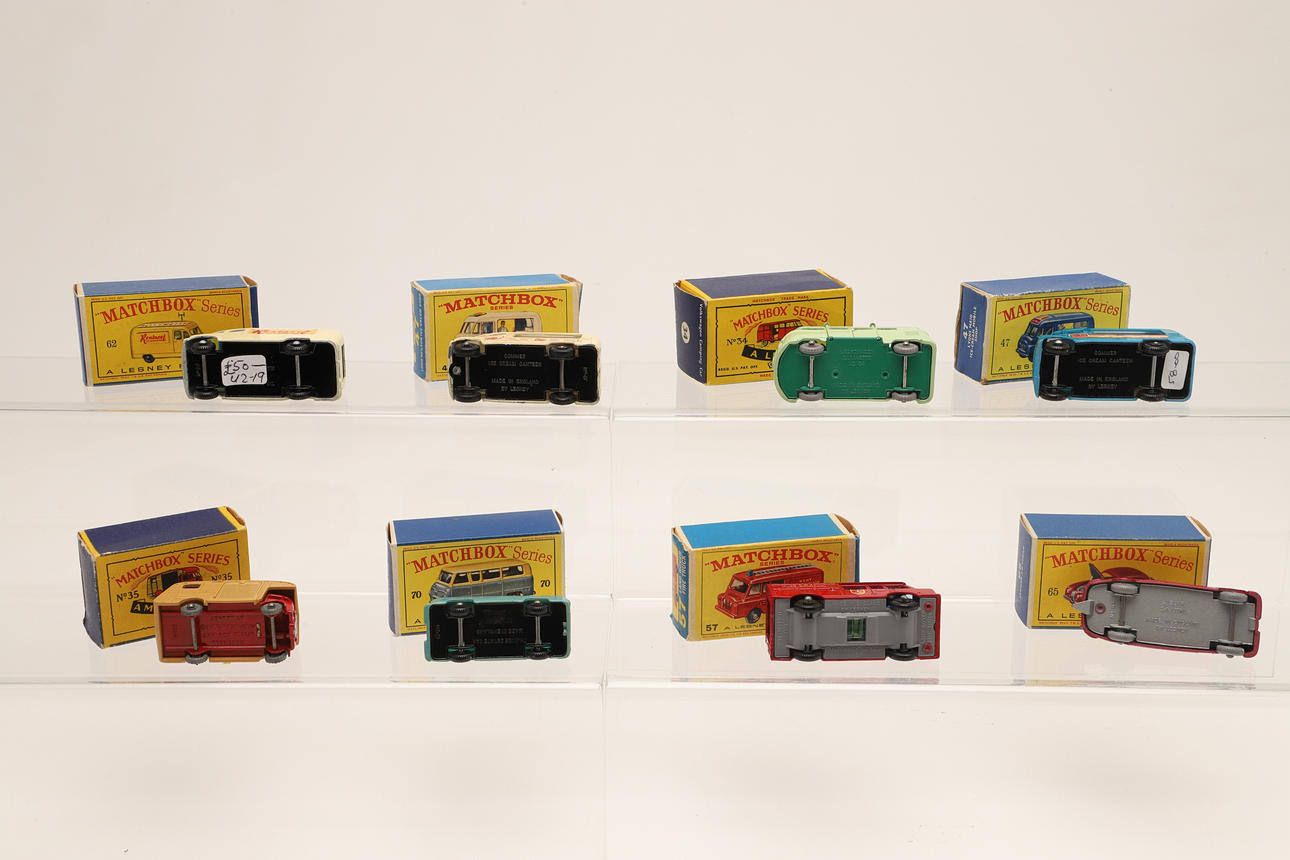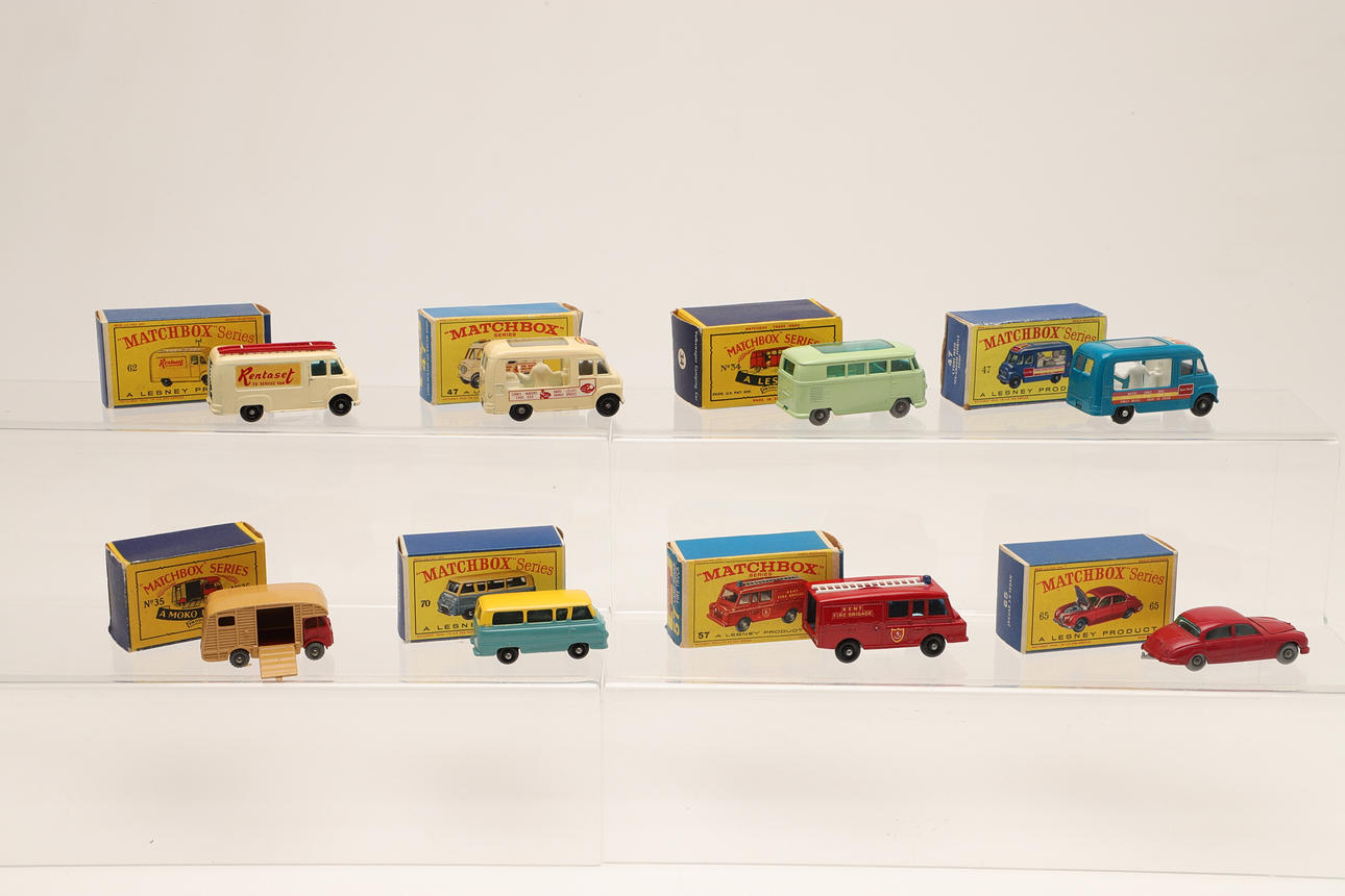 8 boxed models including No 62 TV Service Van (Rentaset), No 57 Land Rover Fire Truck, No 34 Volkswagon Camper (light green body, dark green base), No 70 Ford Thames Estate Car, No 65 Jaguar Sedan, No 35 Horse Box, No 47 Lyons Maid, Ice Cream Mobile Shop, and No 47 Lord Neilson Ice Cream Shop. Largest box 7cms by 4cms. (8).