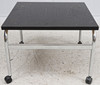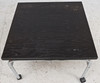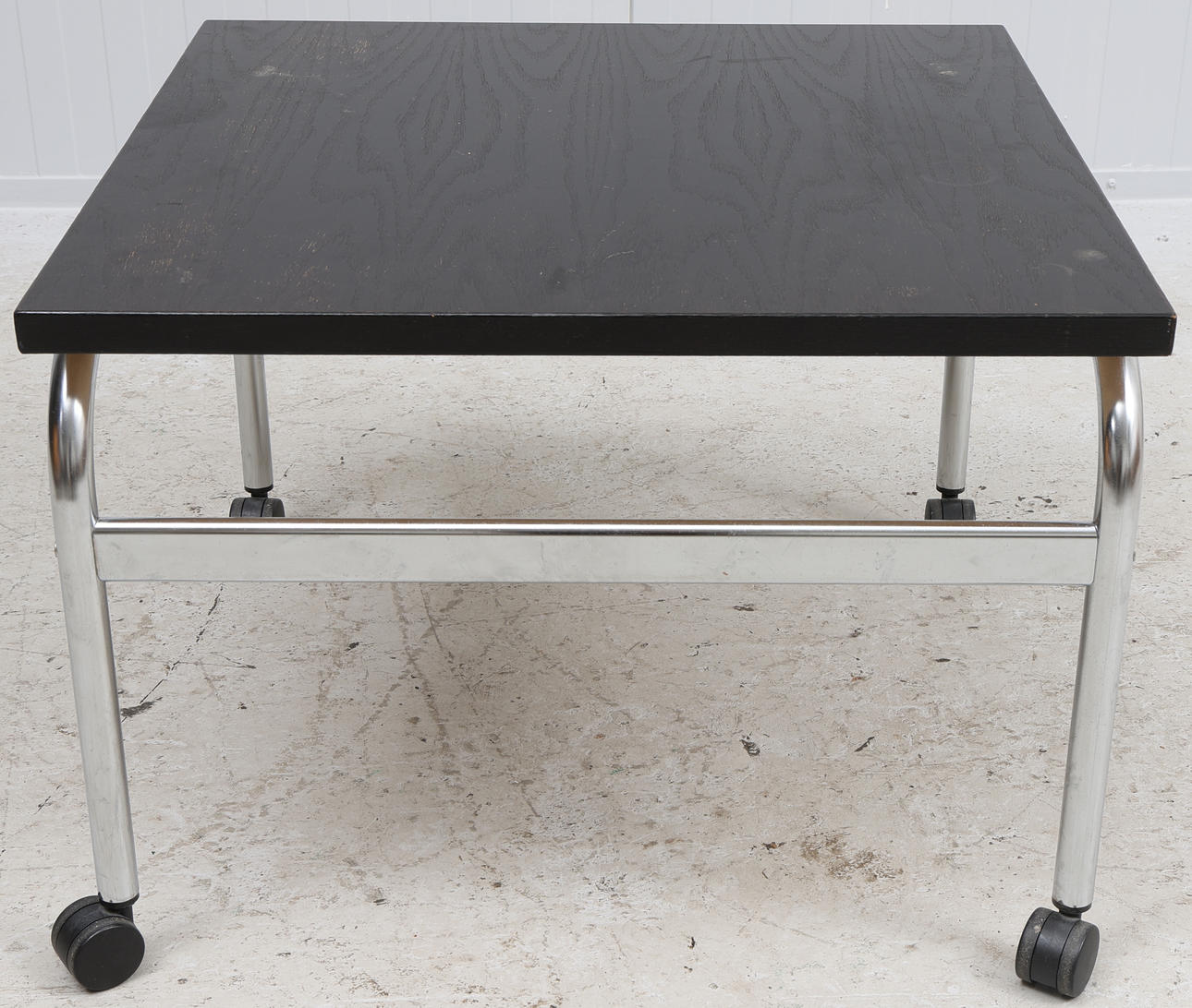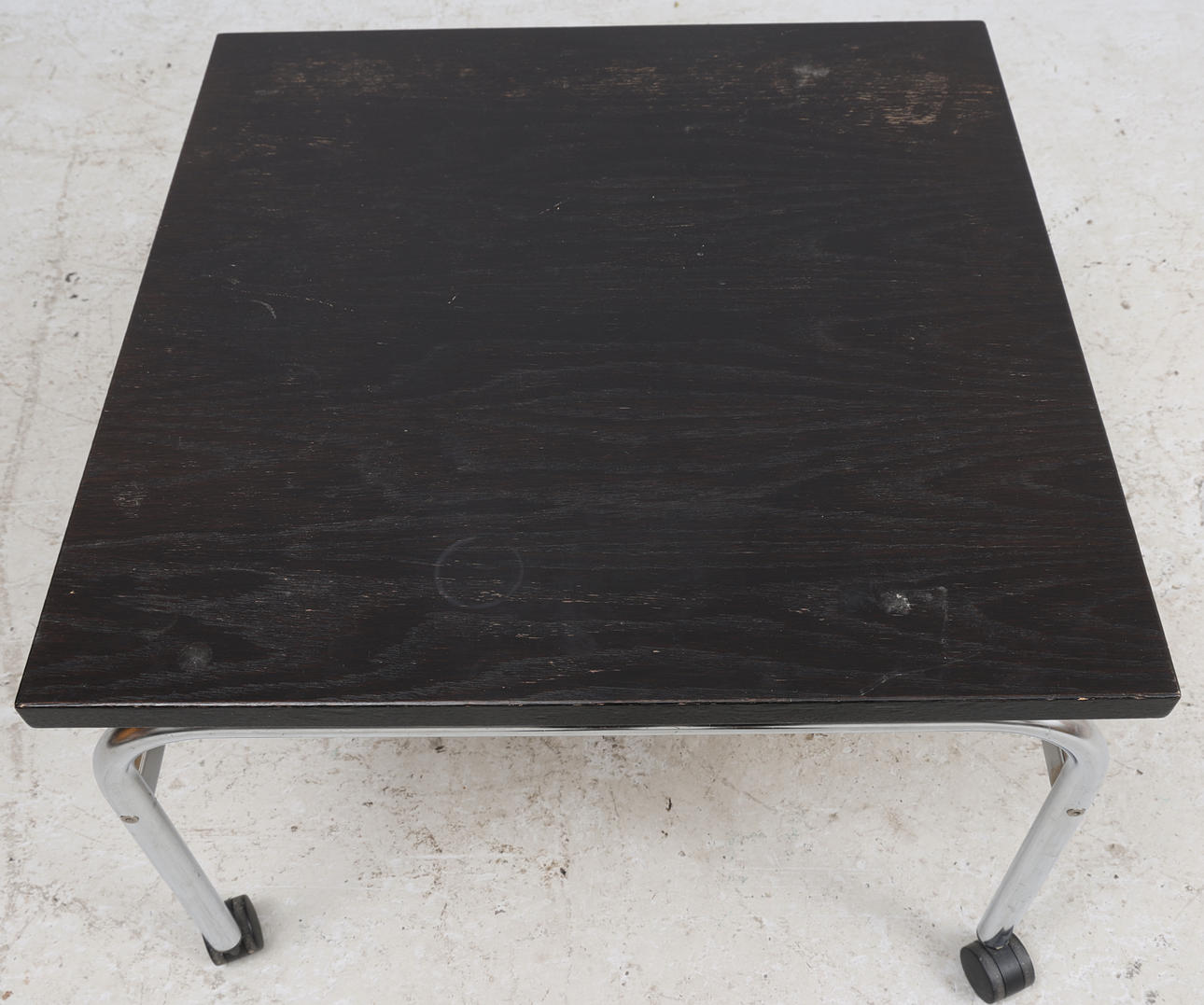 Chromed steel tube frame, board in black lacquered oak. Dimensions approx. 70x70 cm, height approx. 50 cm.
