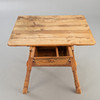 softwood and pinewood. Slanted, partly profiled legs. Wide-sided connecting struts. On the front of the frame, cut out curved at the sides, wide, conical push. Widely projecting table top HxWxD: approx. 73 x 96 x 102 cm.