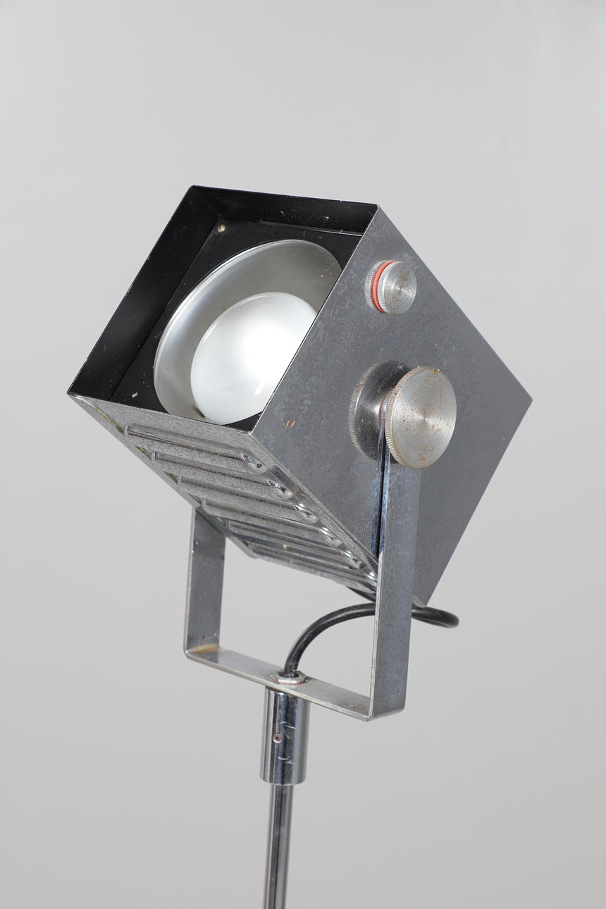 The adjustable angle light on chromed metal tube base.