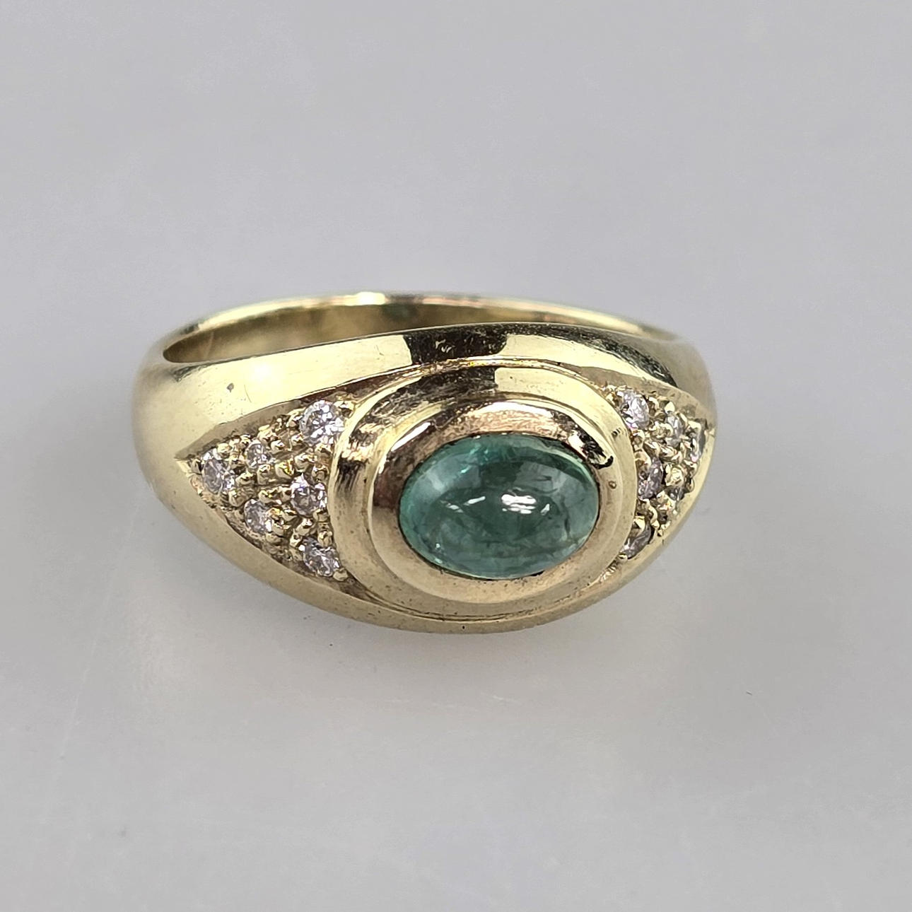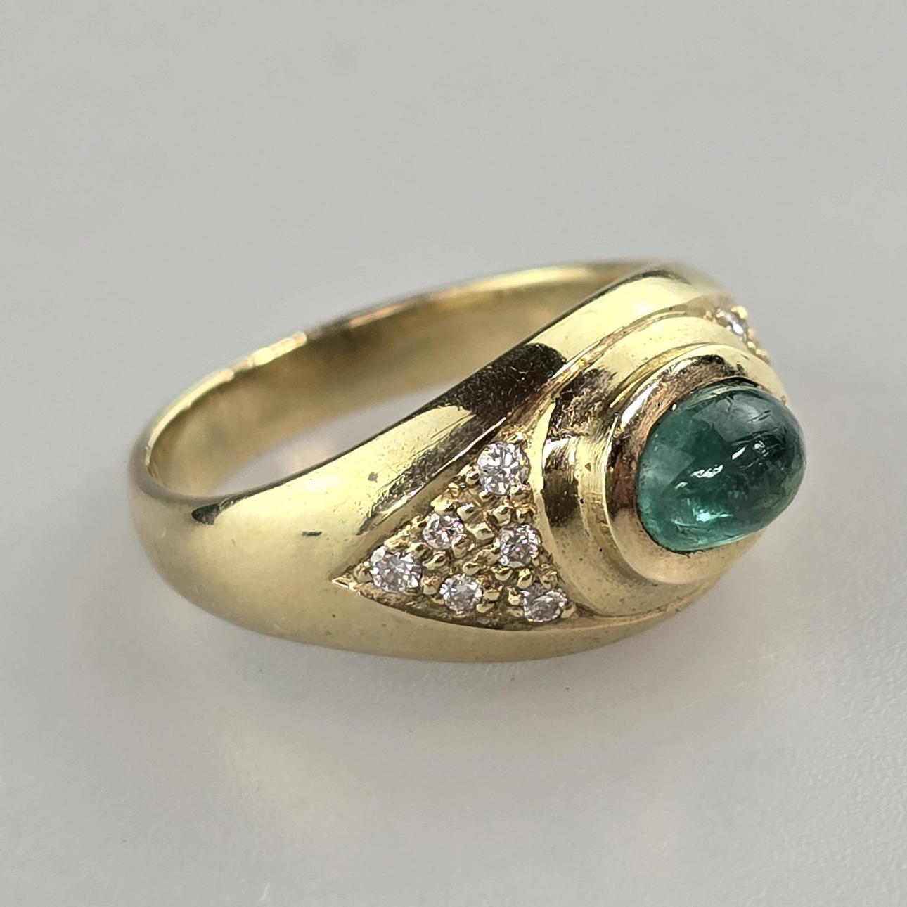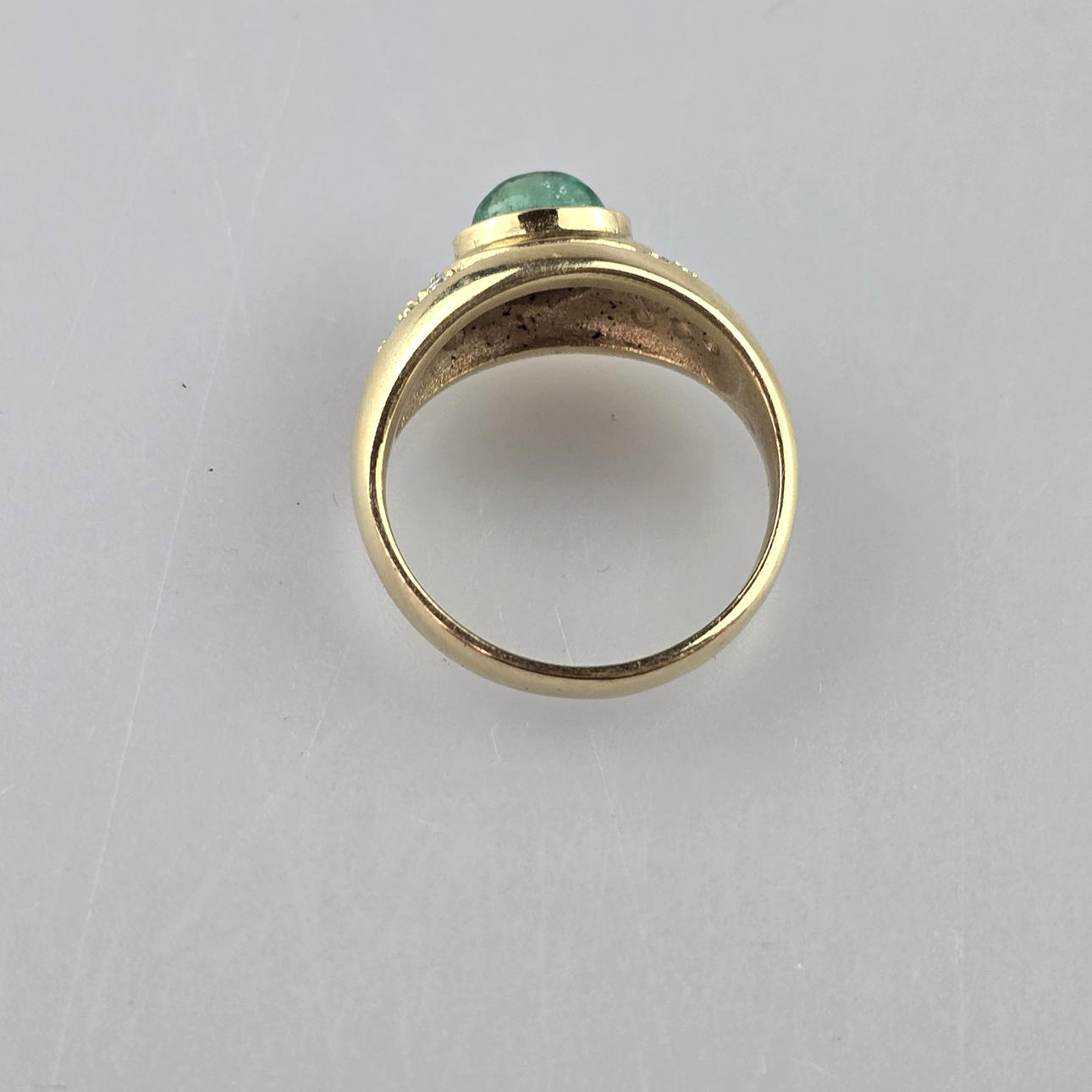 Emerald ring, 585 yellow gold, central emerald: ca. 1.5 ct, ring band set with small diamonds ca. 0.20 ct. (G, VS1),