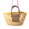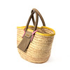 Made of palm. With trimmed edges, handles, shoulder straps and pocket made of suede. Carried in double handles or strap.