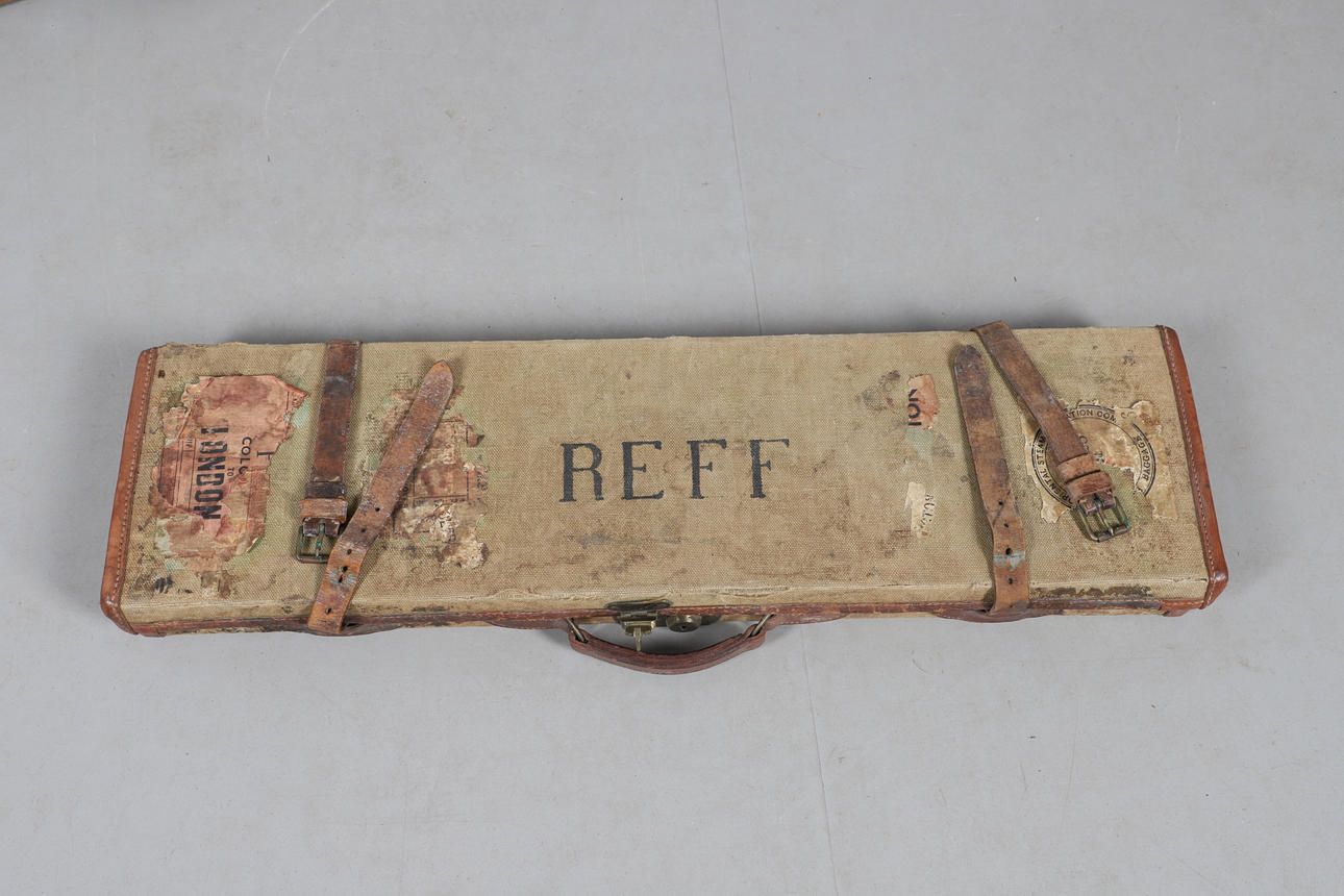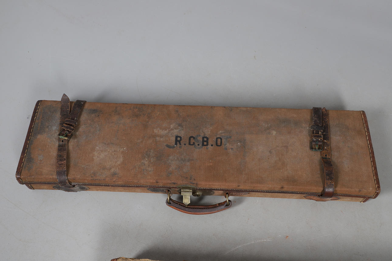 TWO VINTAGE LEATHER & CANVAS SHOT GUN CASES.