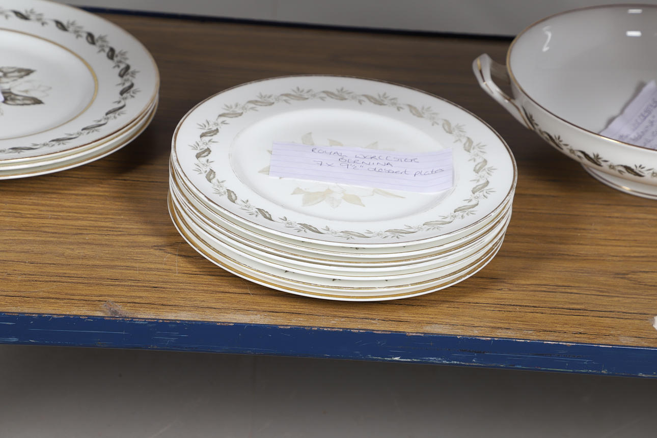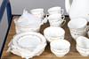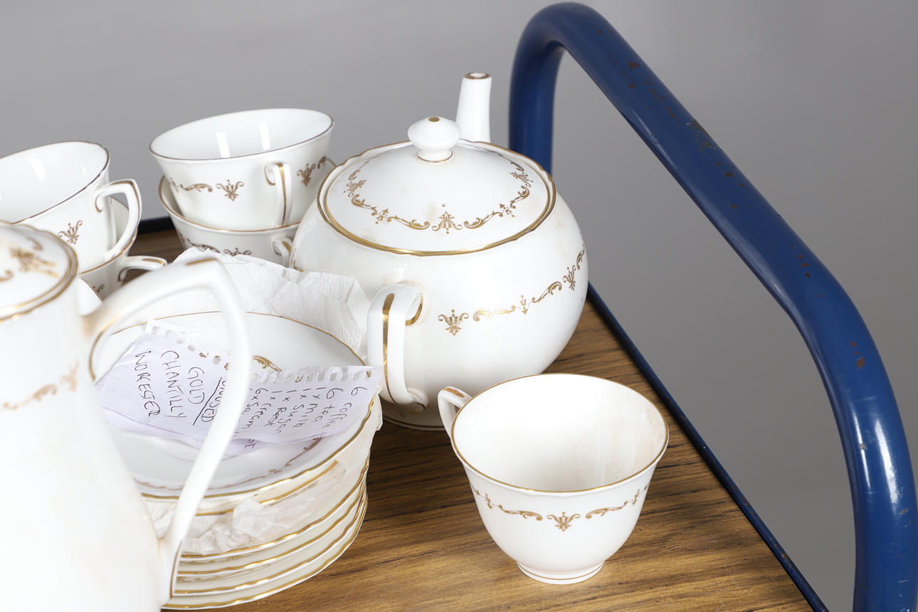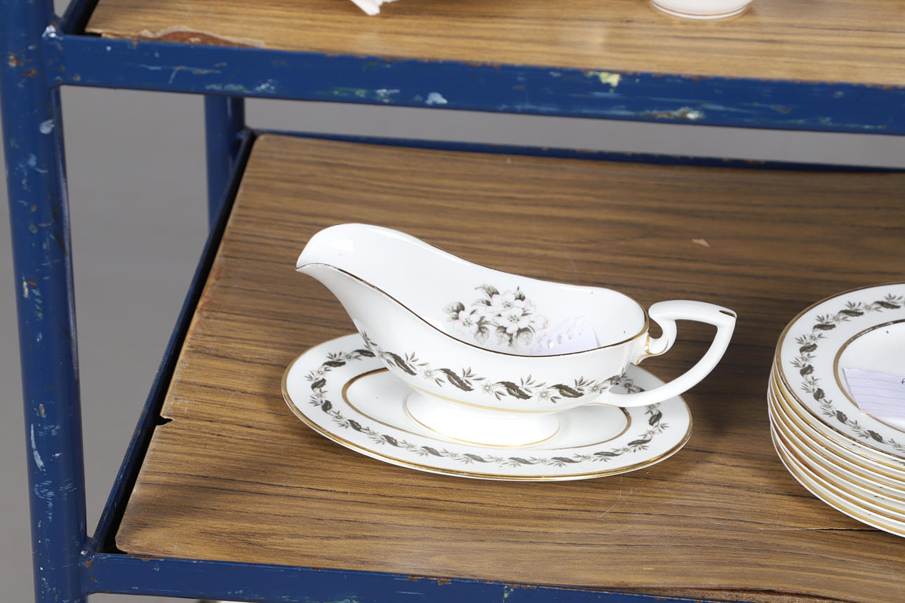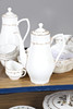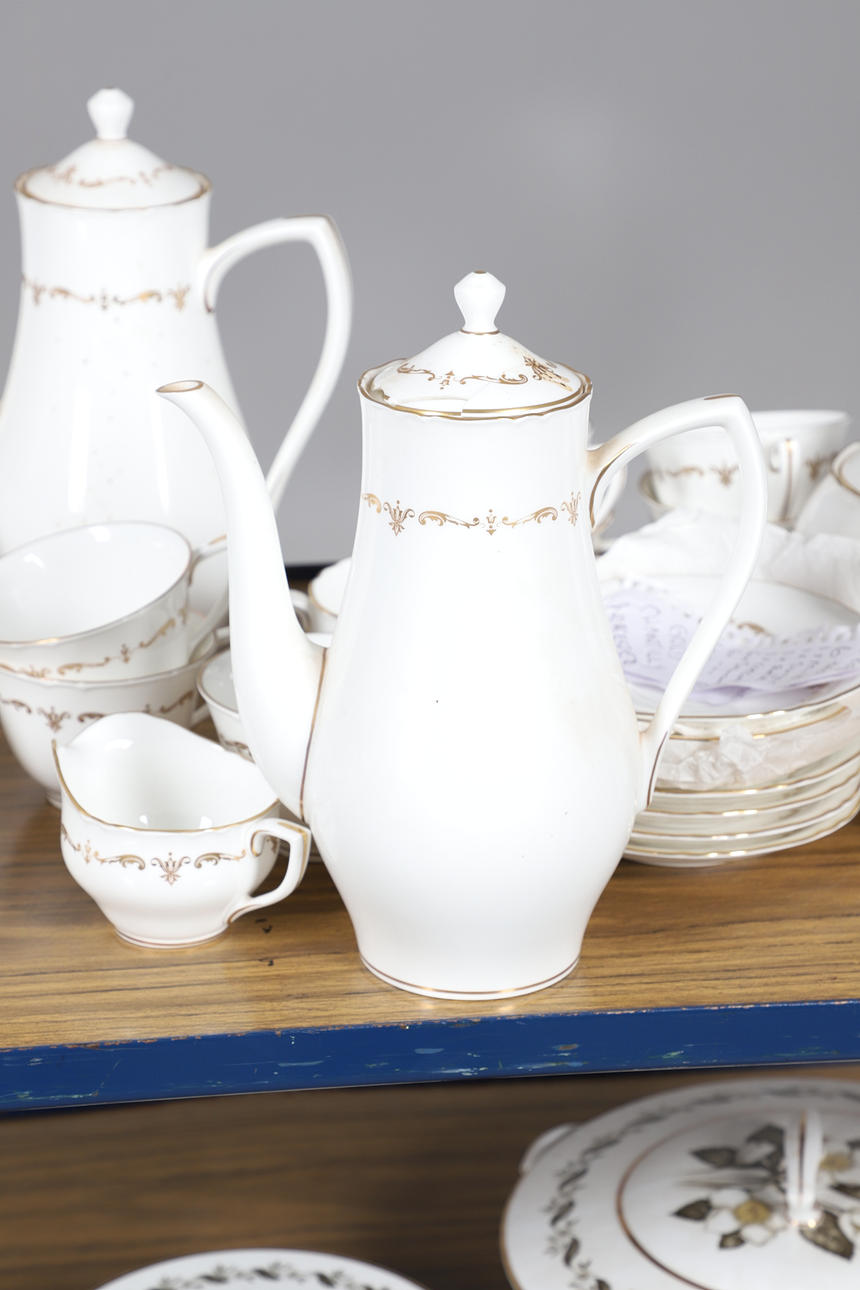 A tea and coffee service in the Gold Chantilly design, including a coffee pot (25cms high), teapot (chip to spout, 15cms high), various tea cups and coffee cups, saucers and small plates. Also with a part dinner service in the Bernina design.
