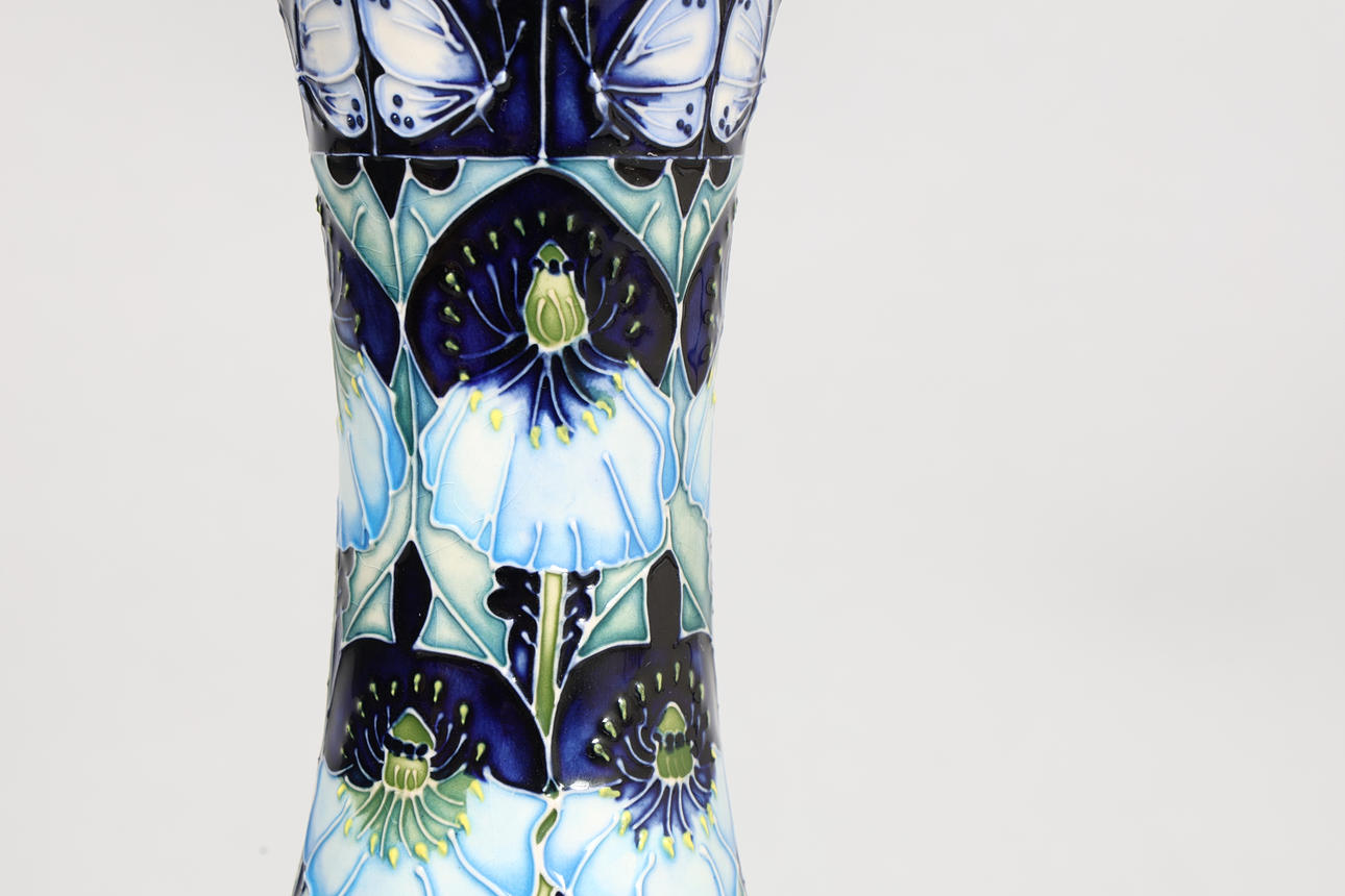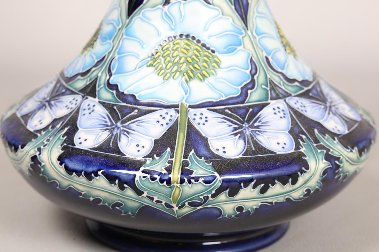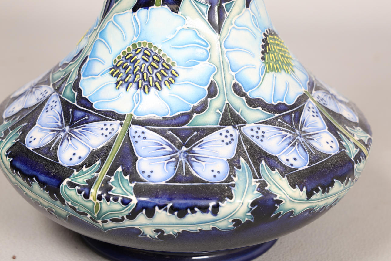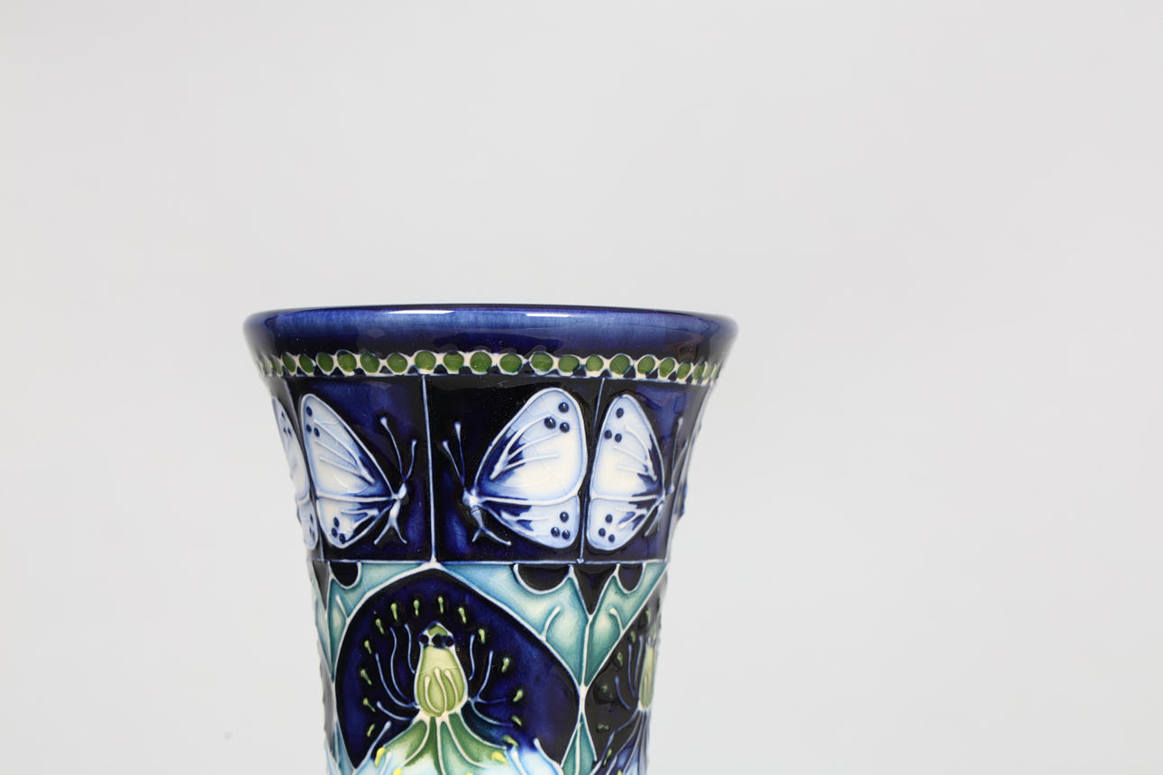 Signed Rachel J. Bishop and dated 2002, limited edition #57 of 200, the Moorcroft vase with floral and butterfly decoration, 29cm height.
