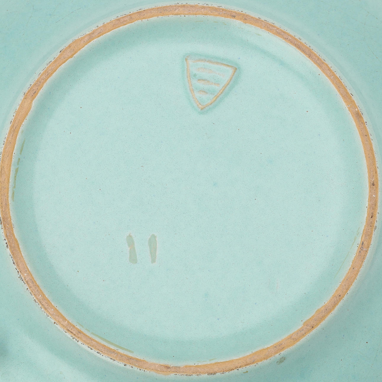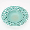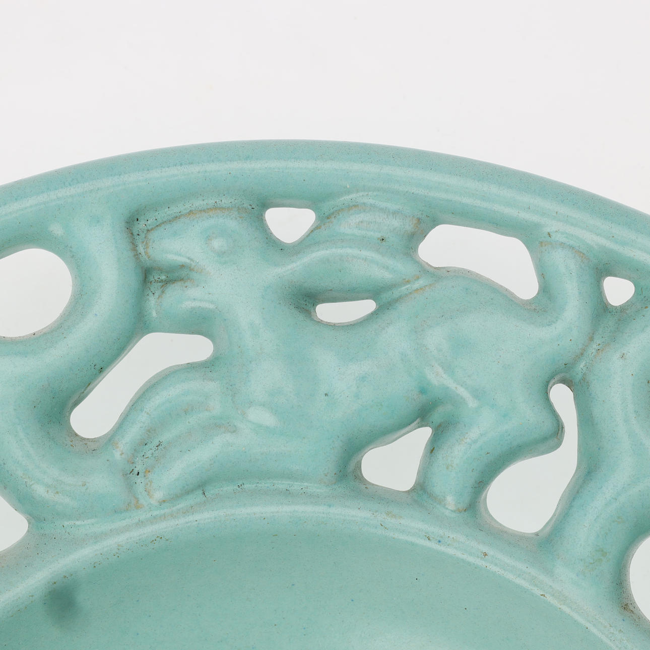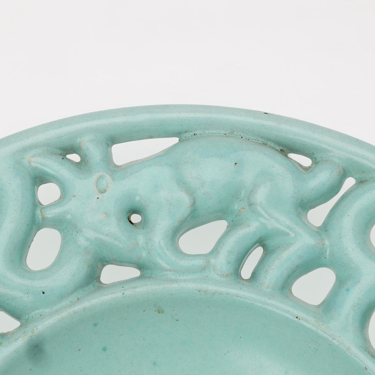 Ceramic dish glazed with turquoise glaze, openwork tab with animal motifs.