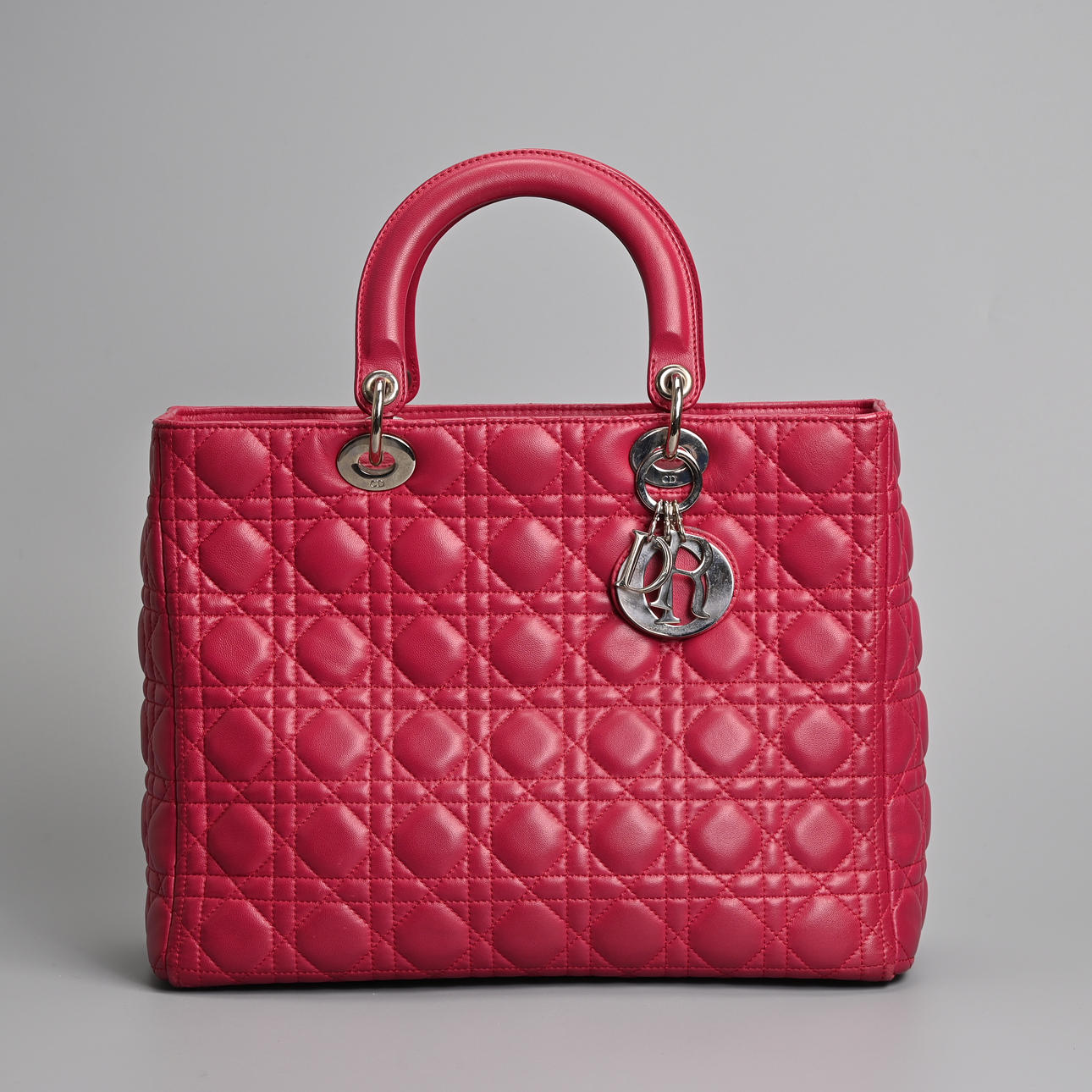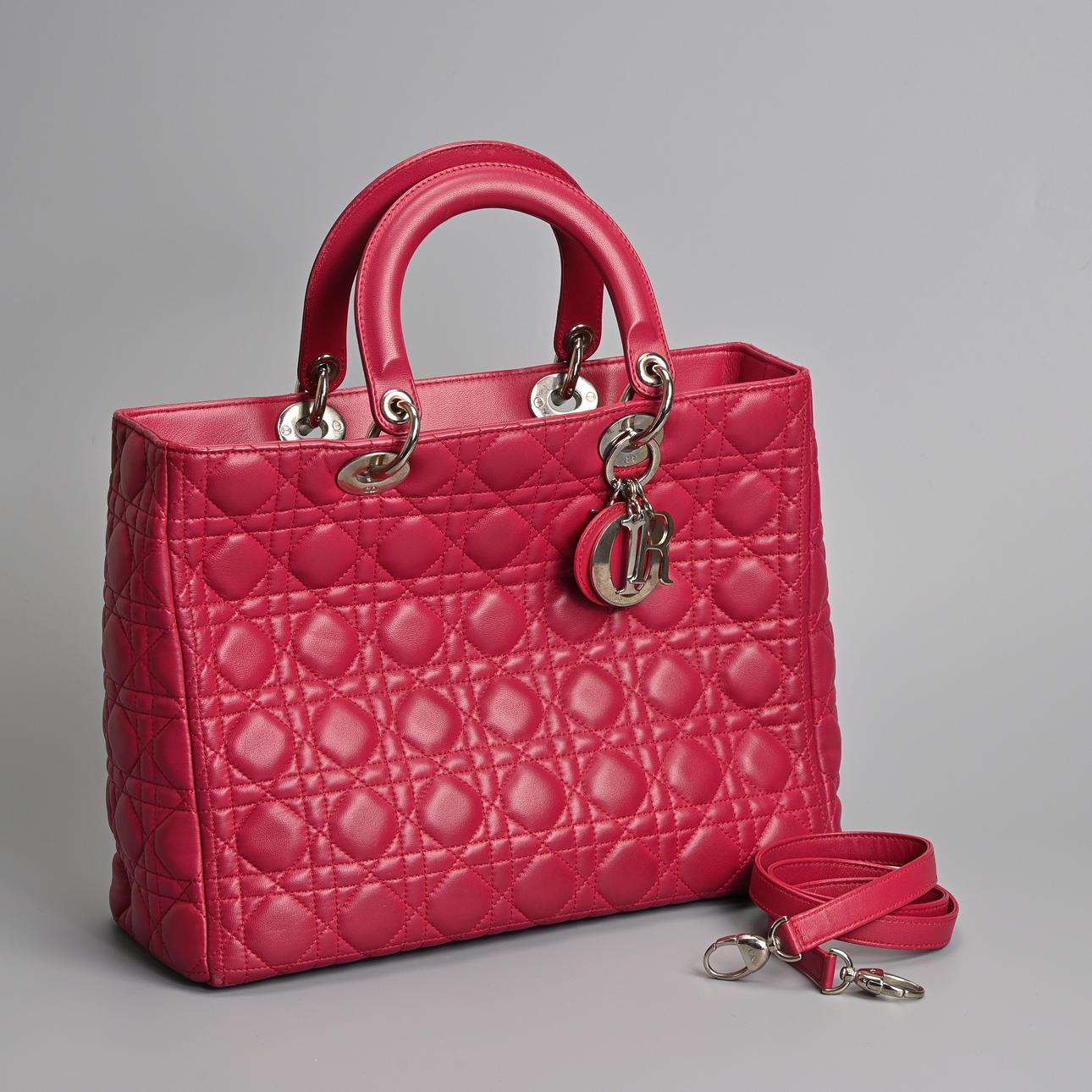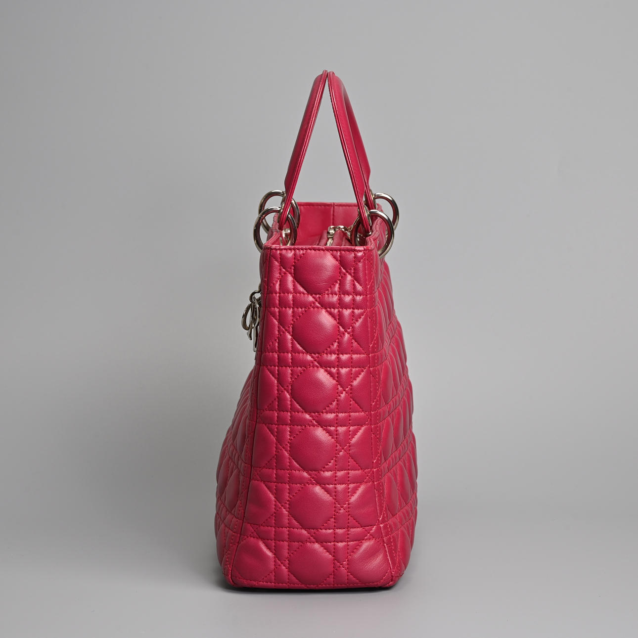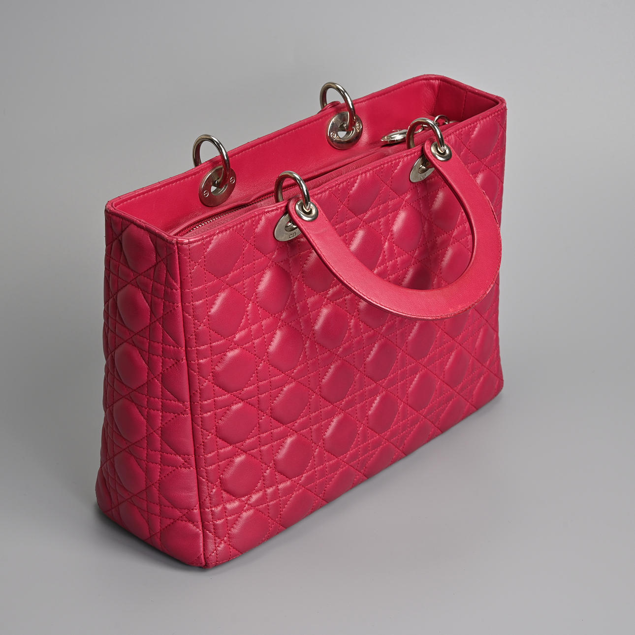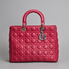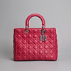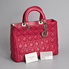 lambskin Cannage in pink fuchsia with silver tone metal hardware. Double handle, one embellished with silver coloured metal 'Dior' letter charms, zip closure. The interior with zip pocket together with separate shoulder strap.