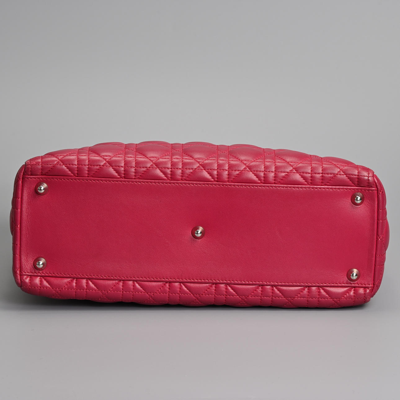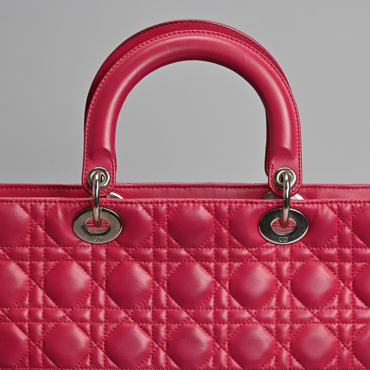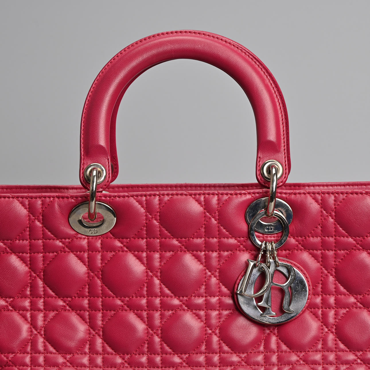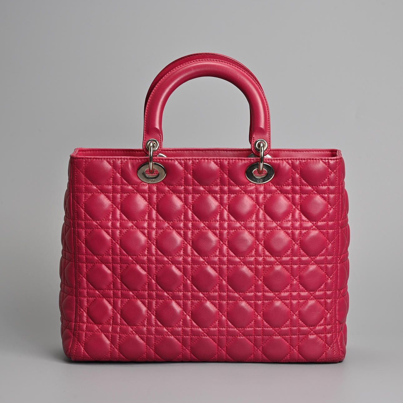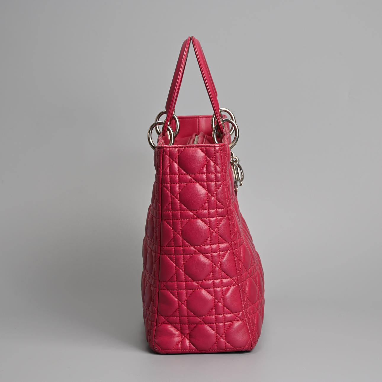 lambskin Cannage in pink fuchsia with silver tone metal hardware. Double handle, one embellished with silver coloured metal 'Dior' letter charms, zip closure. The interior with zip pocket together with separate shoulder strap.