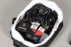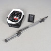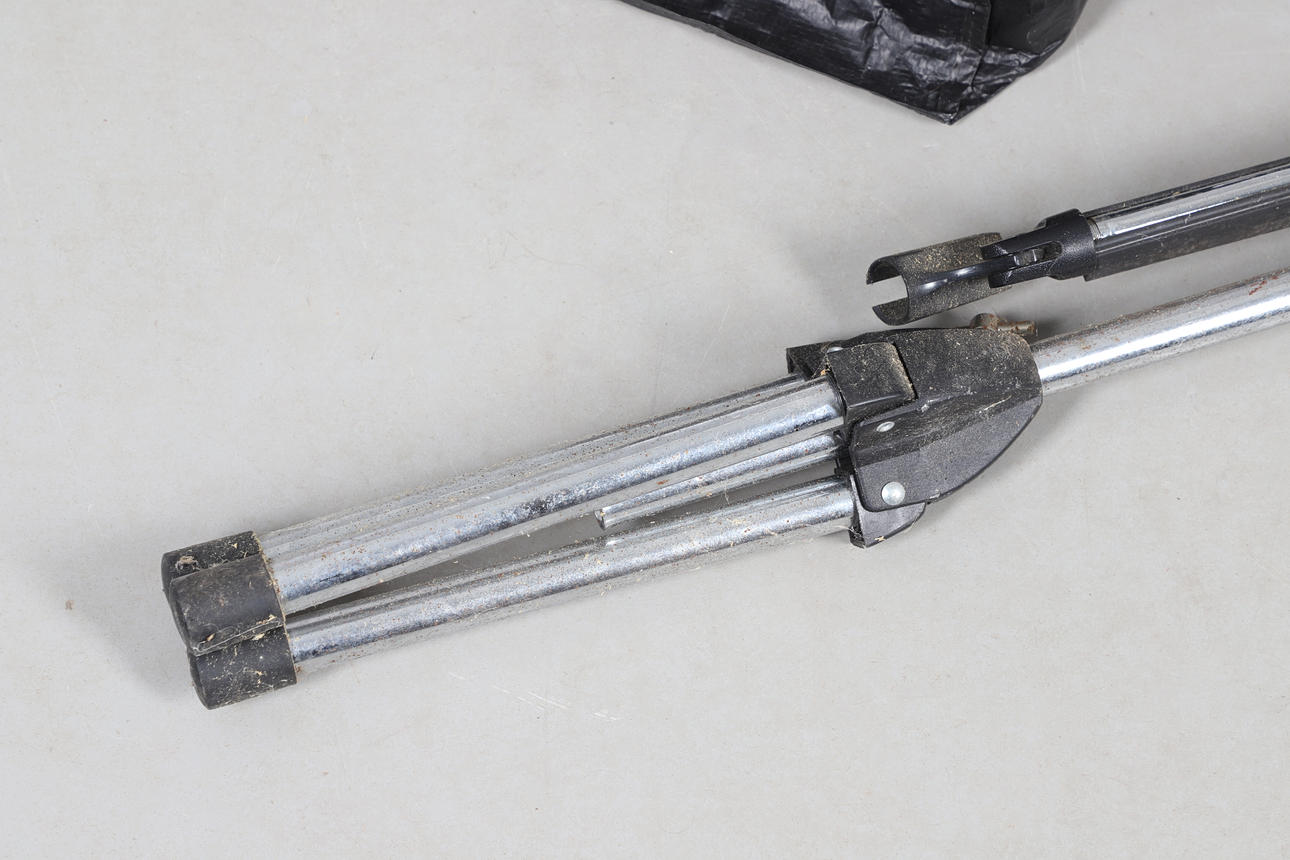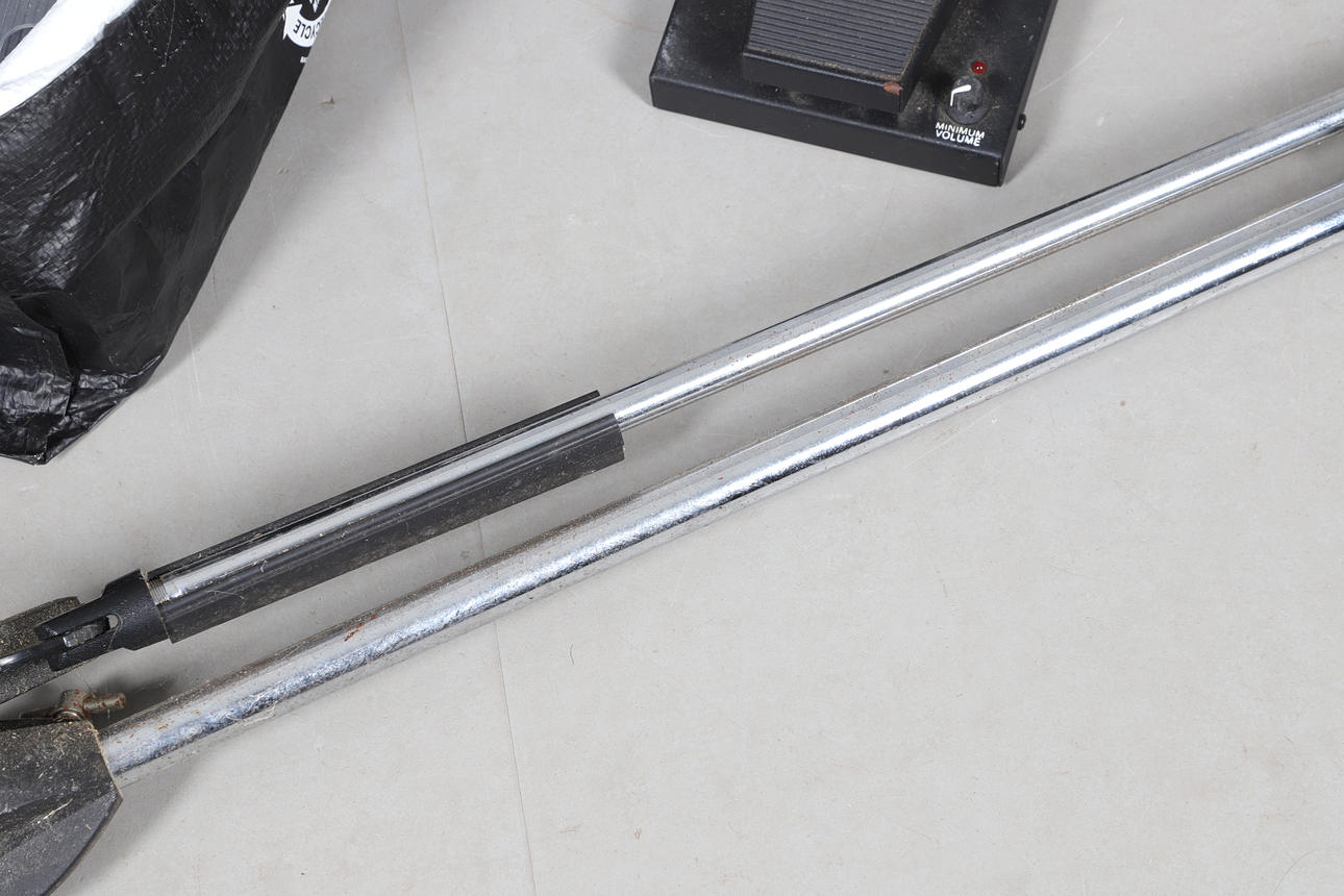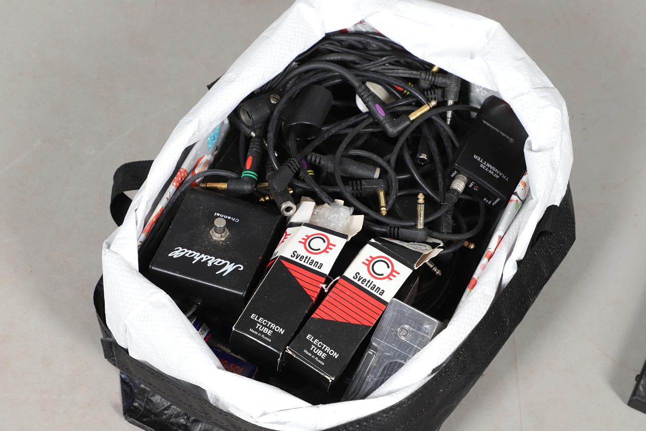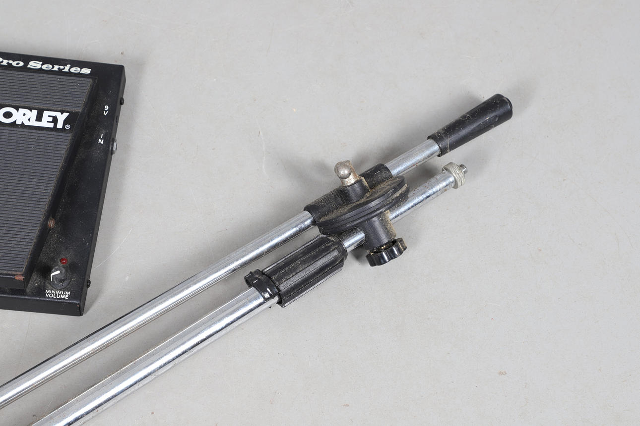 A mixed lot including a Morley pedal, Marshall channel foot switch, lead free transmitter and belt clip, speaker lead and other leads, and a microphone stand. stand 115cms high, bag of items approx 40cms by 35cms and 30cms high.