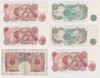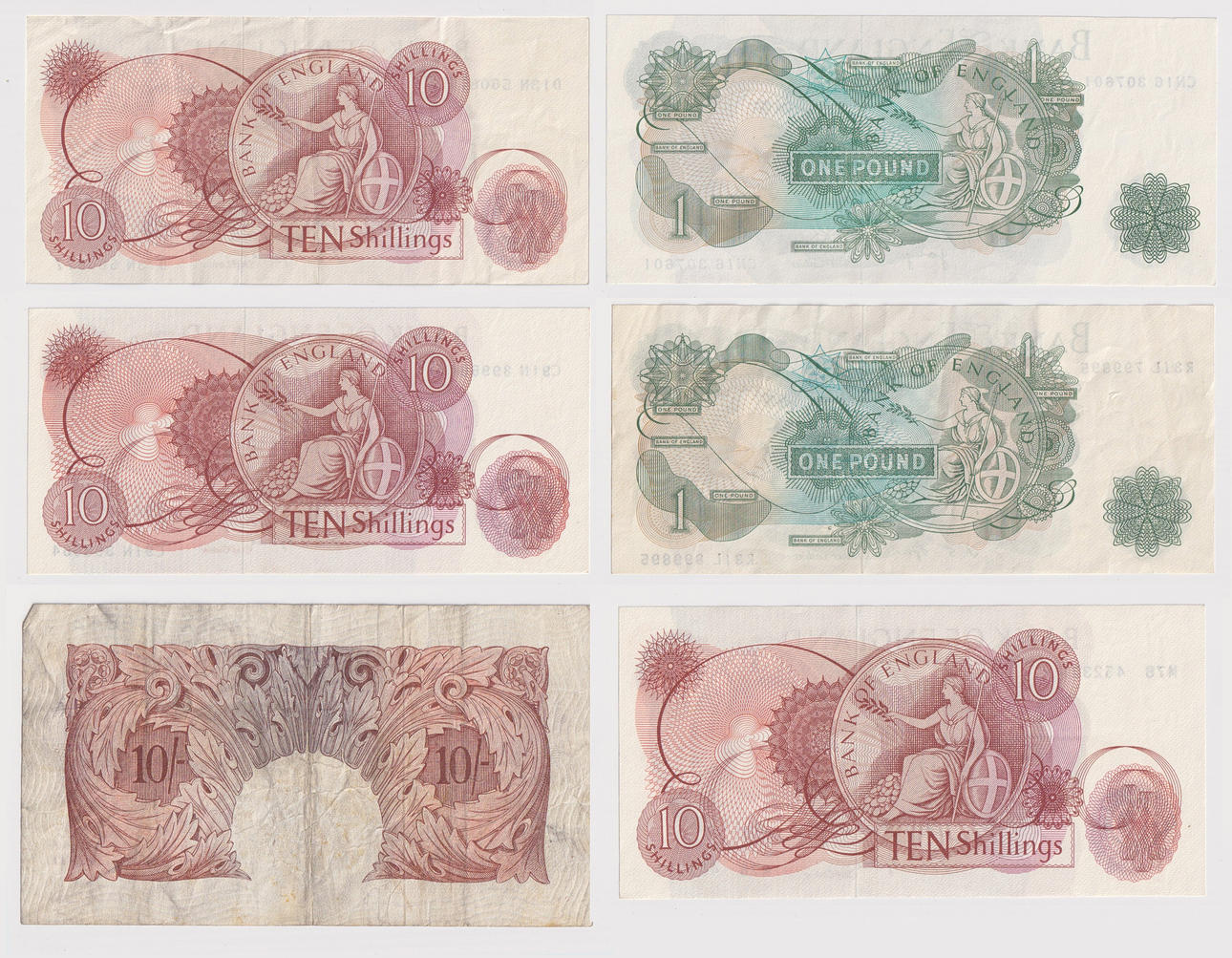 To include two £1 banknotes, serial numbers R31L899895 and CN16307601, together with four 10 Shillings banknotes, serial numbers C91N399564, D13N560877, M78452371 and Z61X149842. (6).
