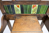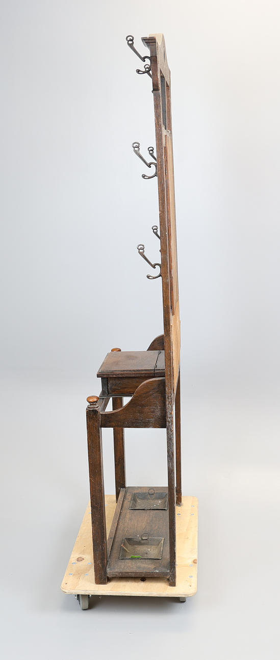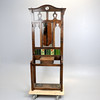 The mirrored back with green glazed tiles flanked by 6 hooks, and an arched top, a compartment with a hinged top flanked by 2 sections for umbrellas or sticks below, each with a drip tray, 193 x 72.5 x 30cm.