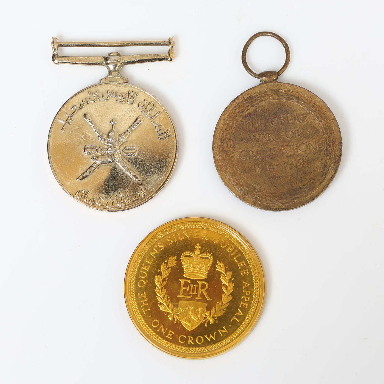 Pobjoy Mint silver crown with COA, together with WW1 Campaign medal and a Oman Sultan Medal (3).