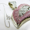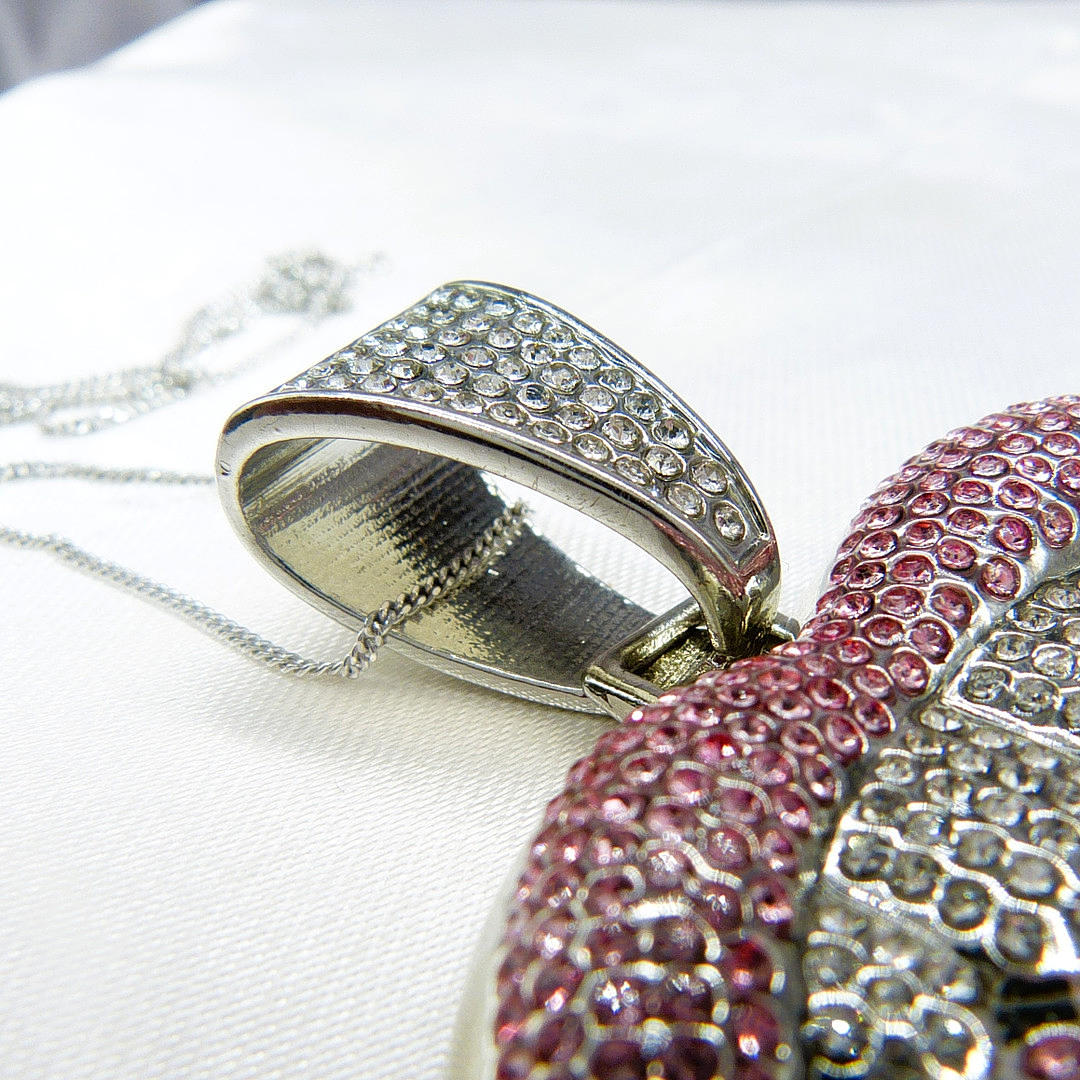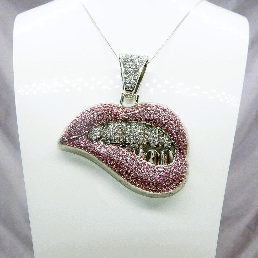 Large Lips Pendant Set With White And Pink Rhinestone Set On White Base Metal And Hung On A Silver Chain (Stamped 925)