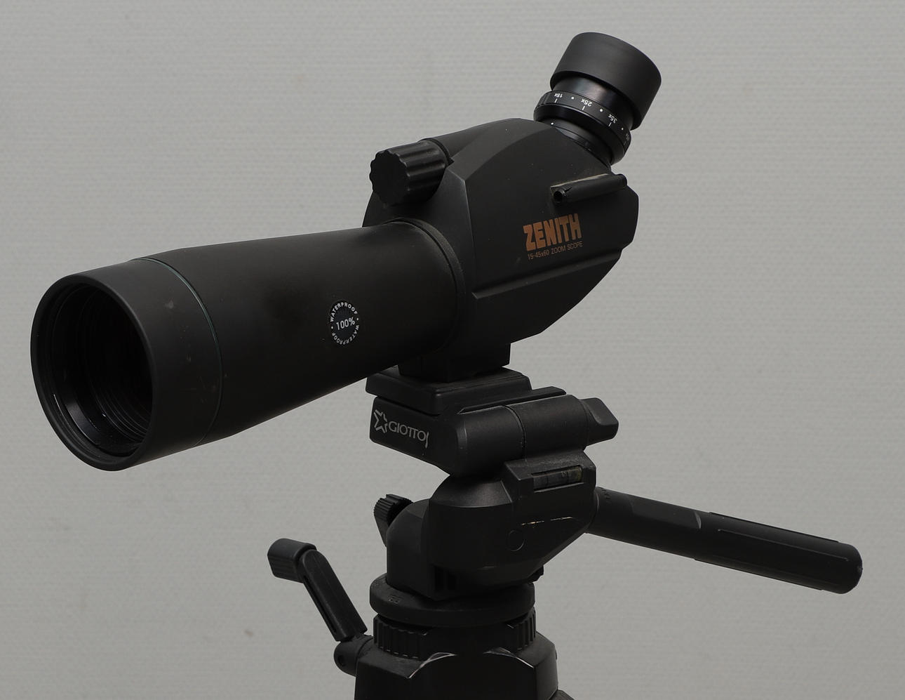 Single binoculars, Zenith 15-45x60 Zoom Scope, length approx. 33 cm. Stand, Giottos VT 809, max height approx. 168,5 cm.